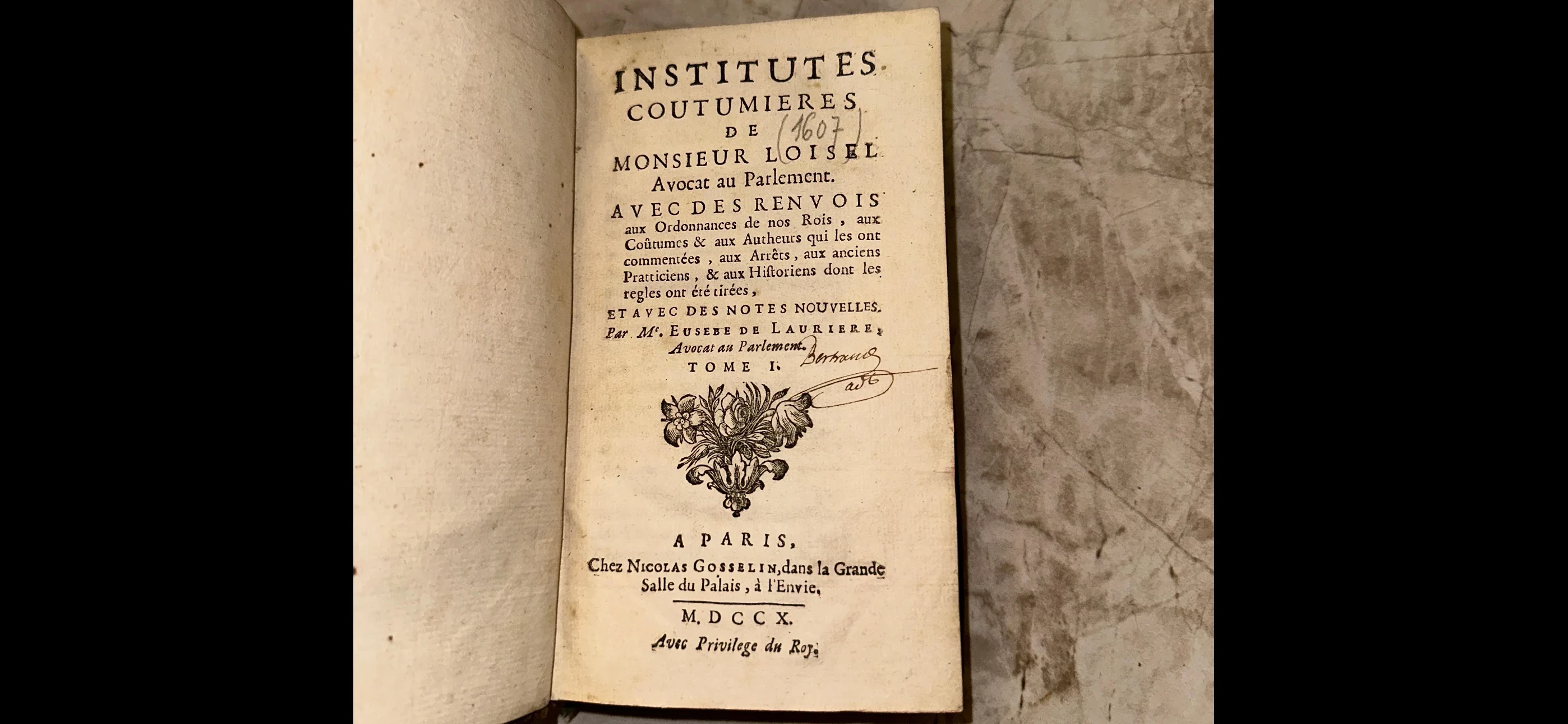 Редкое парижское издание юридического трактата Антуана Луазеля, напечатанное в типографии Николя Госселена в начале XVIII века. Страница сохранила благородную патину времени и украшена изящной цветочной виньеткой, а рукописные пометки прежних владельцев добавляют предмету уникальный исторический шарм. Этот экземпляр станет жемчужиной коллекции старинной юридической литературы или изысканным подарком для ценителя французской истории.