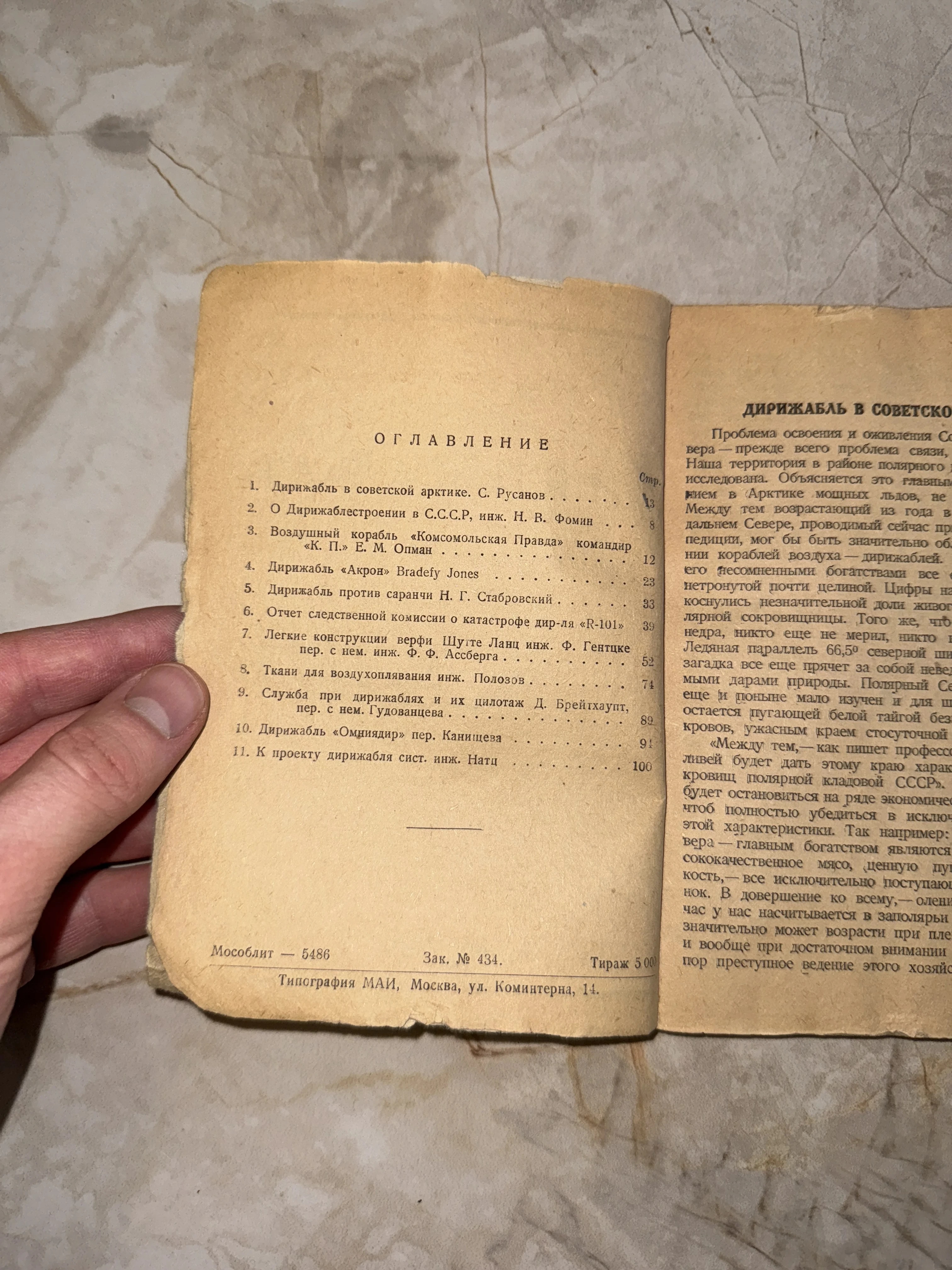 Разворот старой советской книги с оглавлением и текстом о дирижаблях в Арктике на пожелтевшей бумаге.