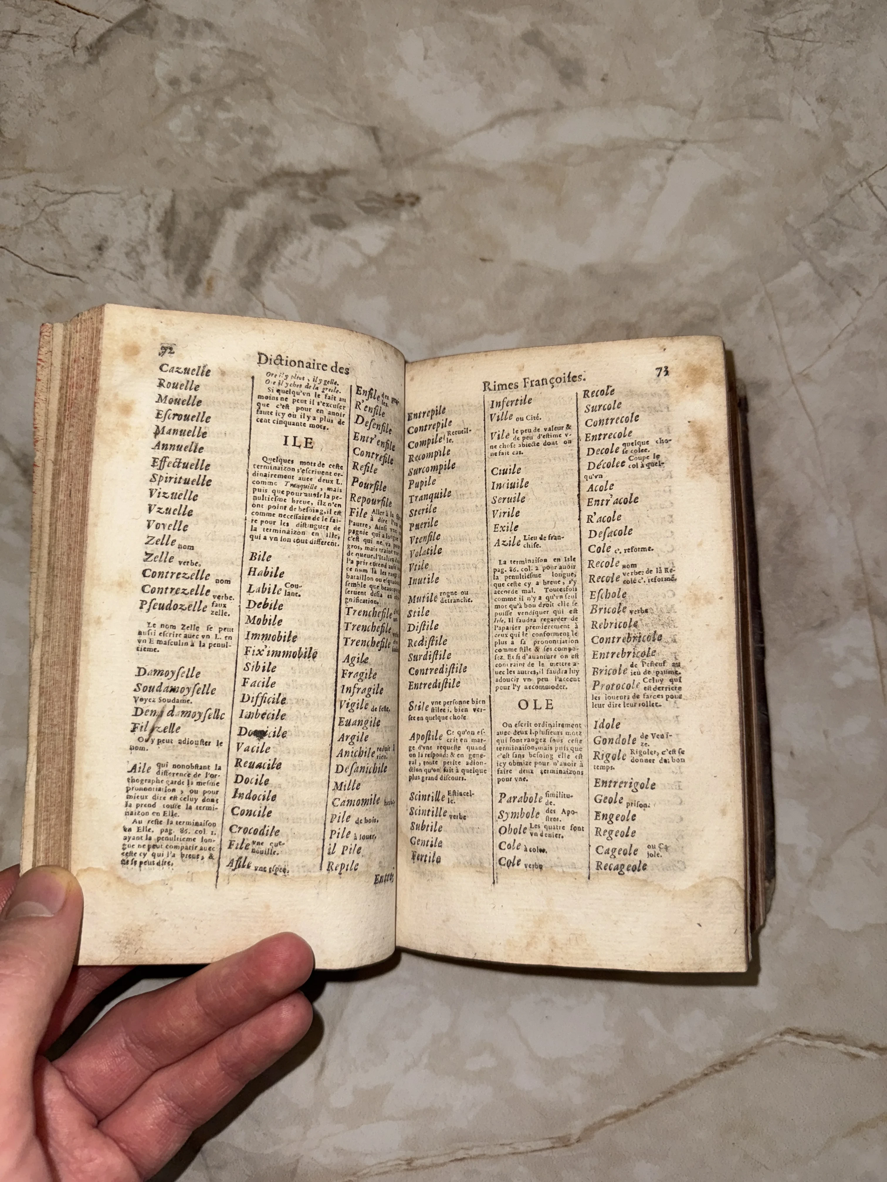 Разворот антикварной книги со списками слов на французском языке, озаглавленный Dictionaire des Rimes Françoises.