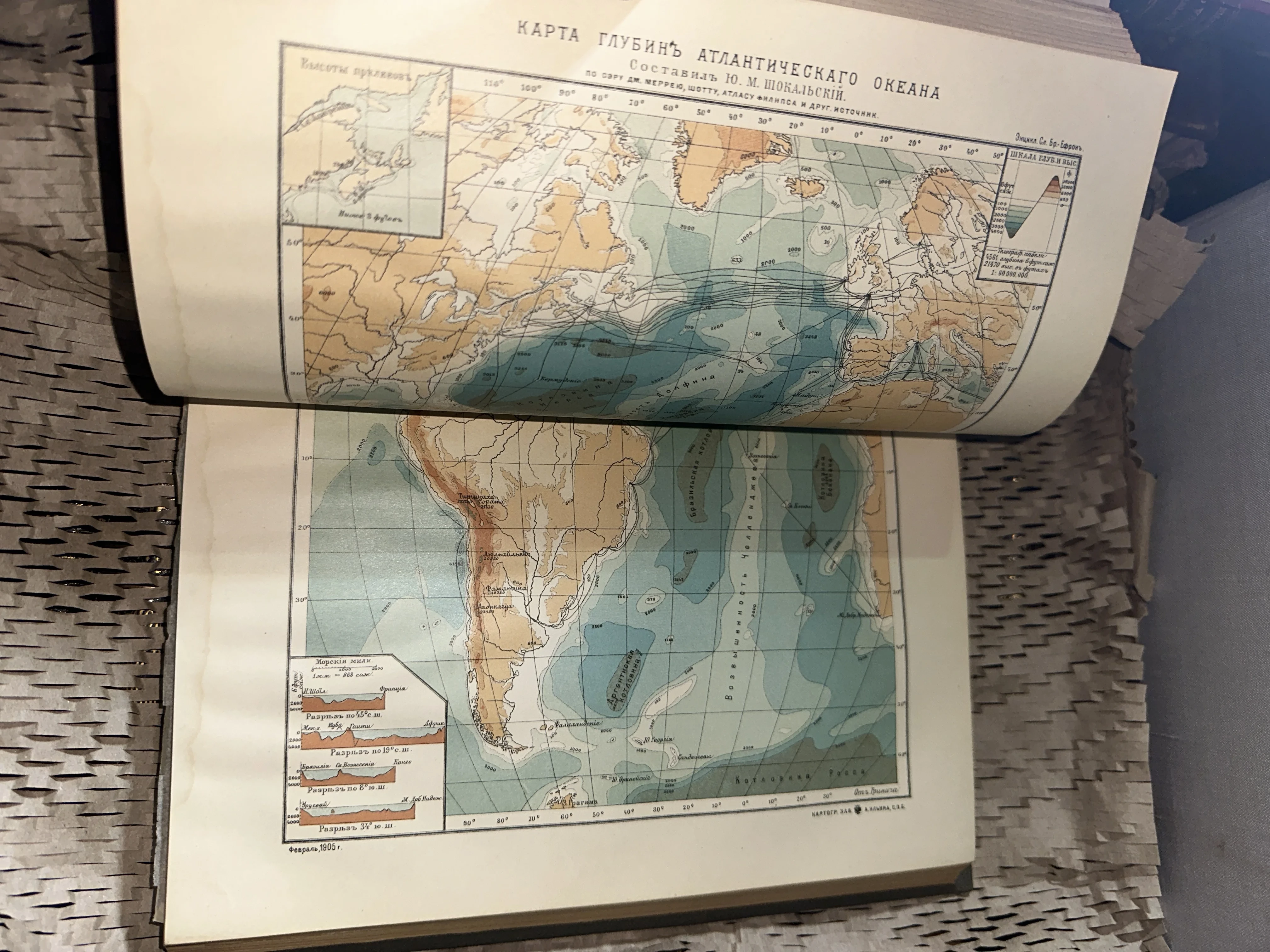 Разворот старинной книги с цветной литографированной картой глубин Атлантического океана авторства Ю. М. Шокальского.