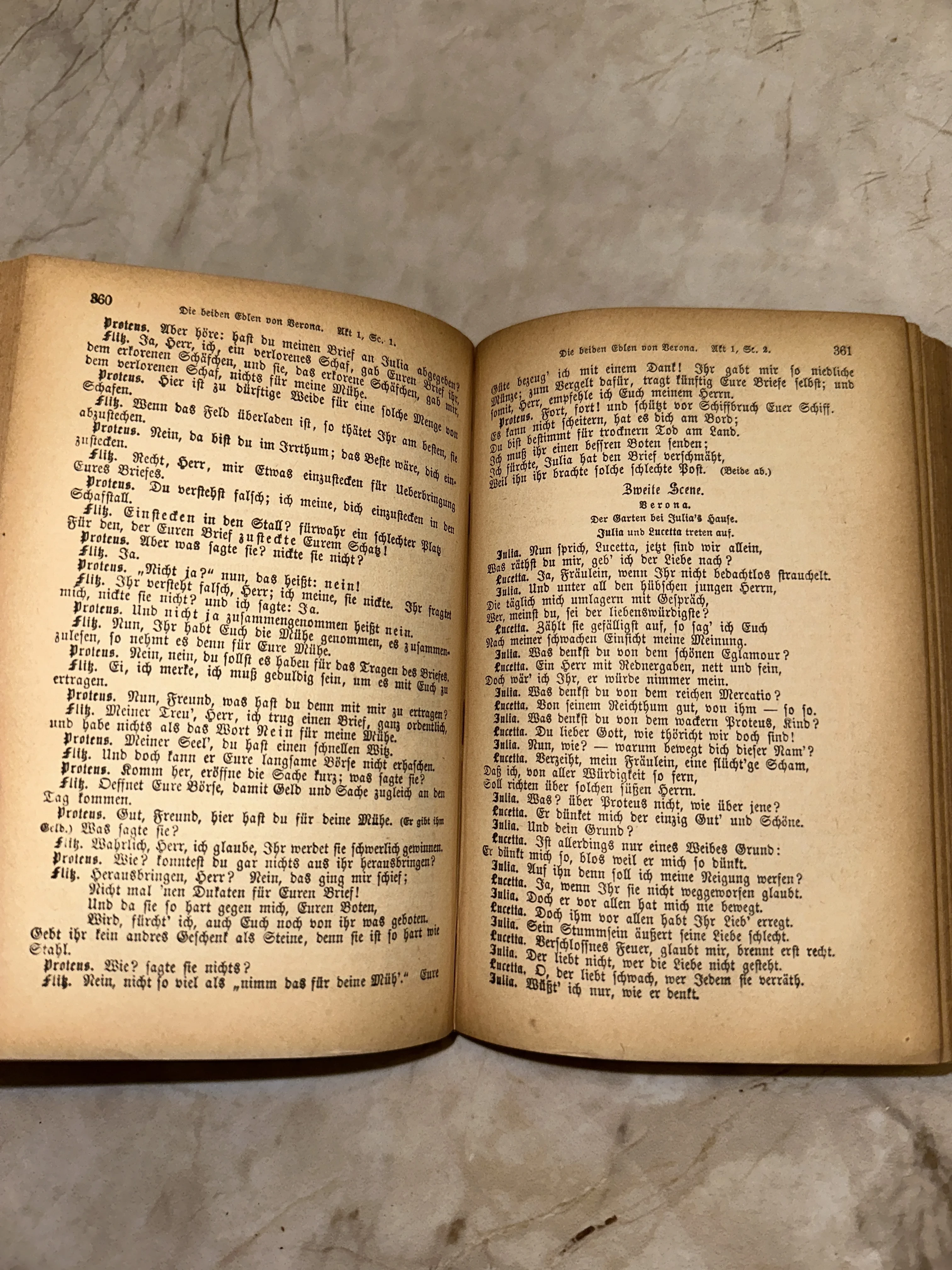 Изящный разворот антикварного тома с текстом комедии Шекспира «Два веронца», напечатанный классическим готическим шрифтом. Пожелтевшие страницы с благородной патиной времени подчеркивают аутентичность издания, а четкий типографский оттиск свидетельствует о высоком качестве печати прошлых столетий. Этот экземпляр станет изысканным дополнением коллекции европейской классики и украшением книжной полки.