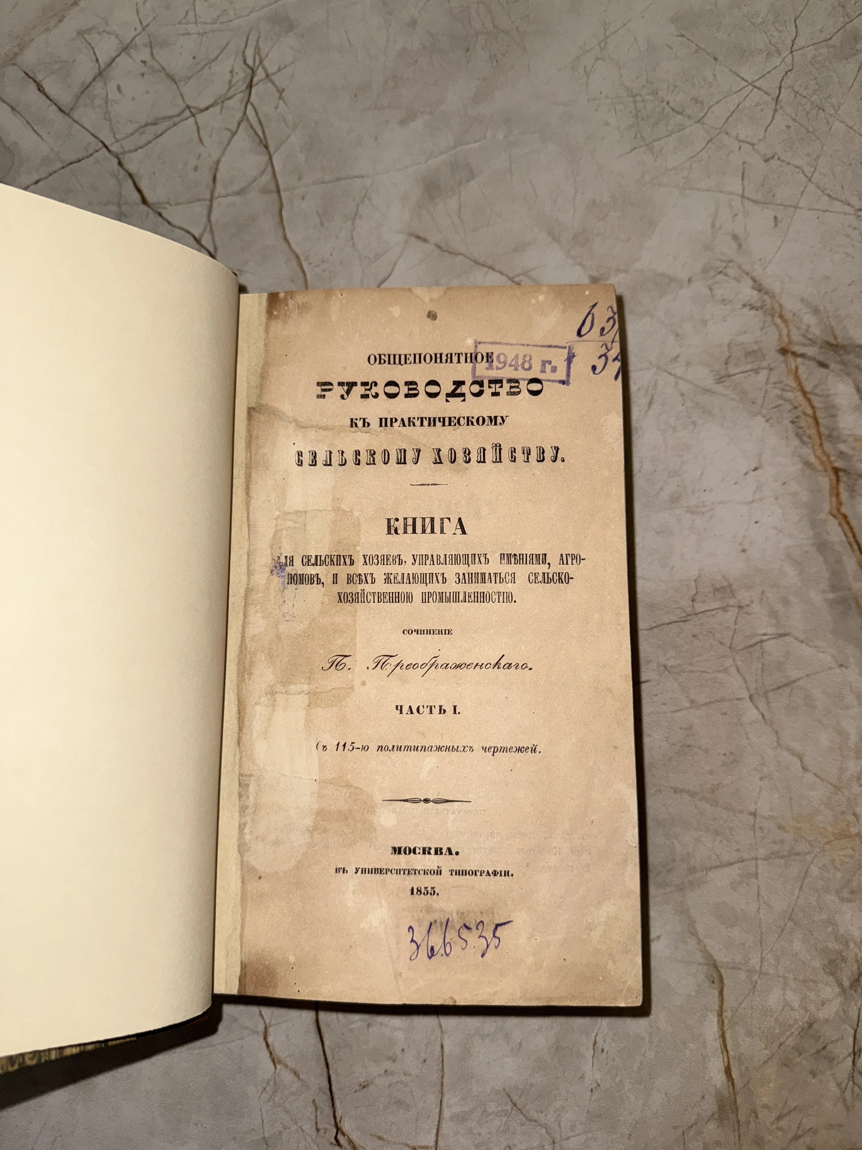 Уникальное прижизненное издание середины XIX века, отпечатанное в Московской университетской типографии. Пожелтевшая бумага с аутентичными библиотечными штампами и рукописными пометами передает подлинную атмосферу дореволюционной России. Этот экземпляр станет ценным приобретением для коллекционера редкой букинистики или исследователя истории аграрной науки.