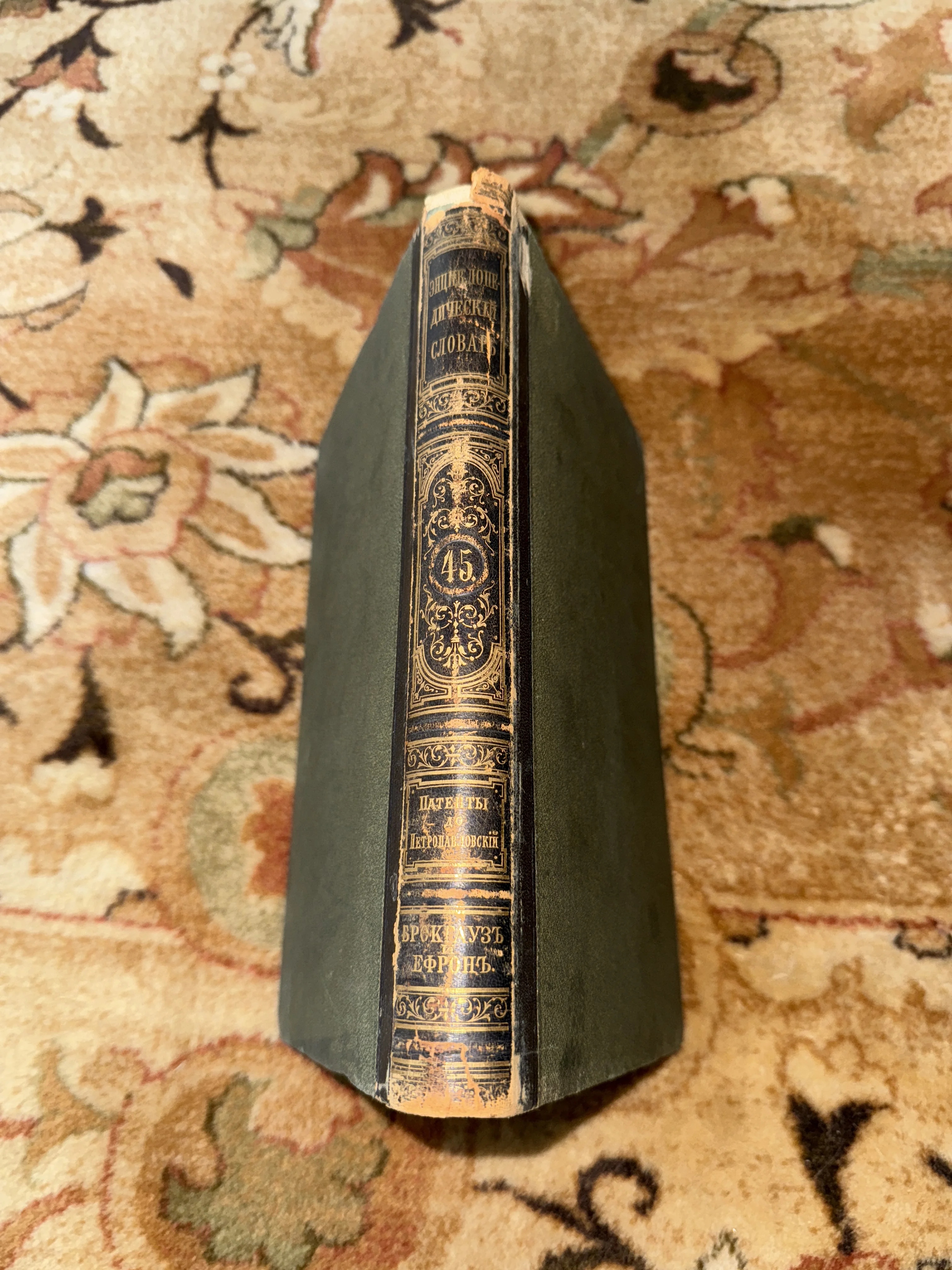 Корешок антикварной книги Брокгауза и Ефрона, 45 том, с золотым орнаментальным тиснением на темном переплете.