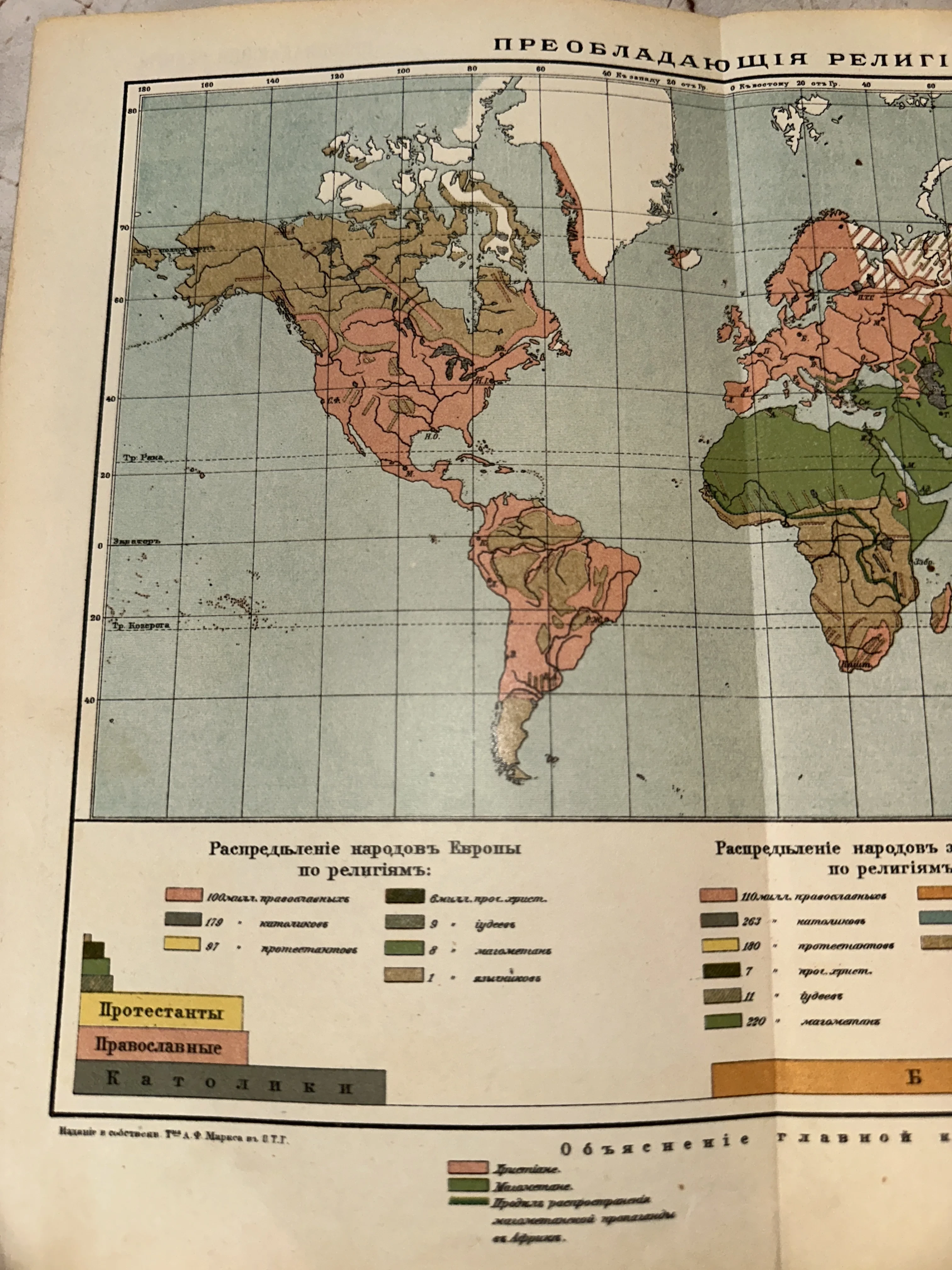 Фрагмент антикварной цветной карты мира на русском языке с легендой о распределении народов по вероисповеданиям.