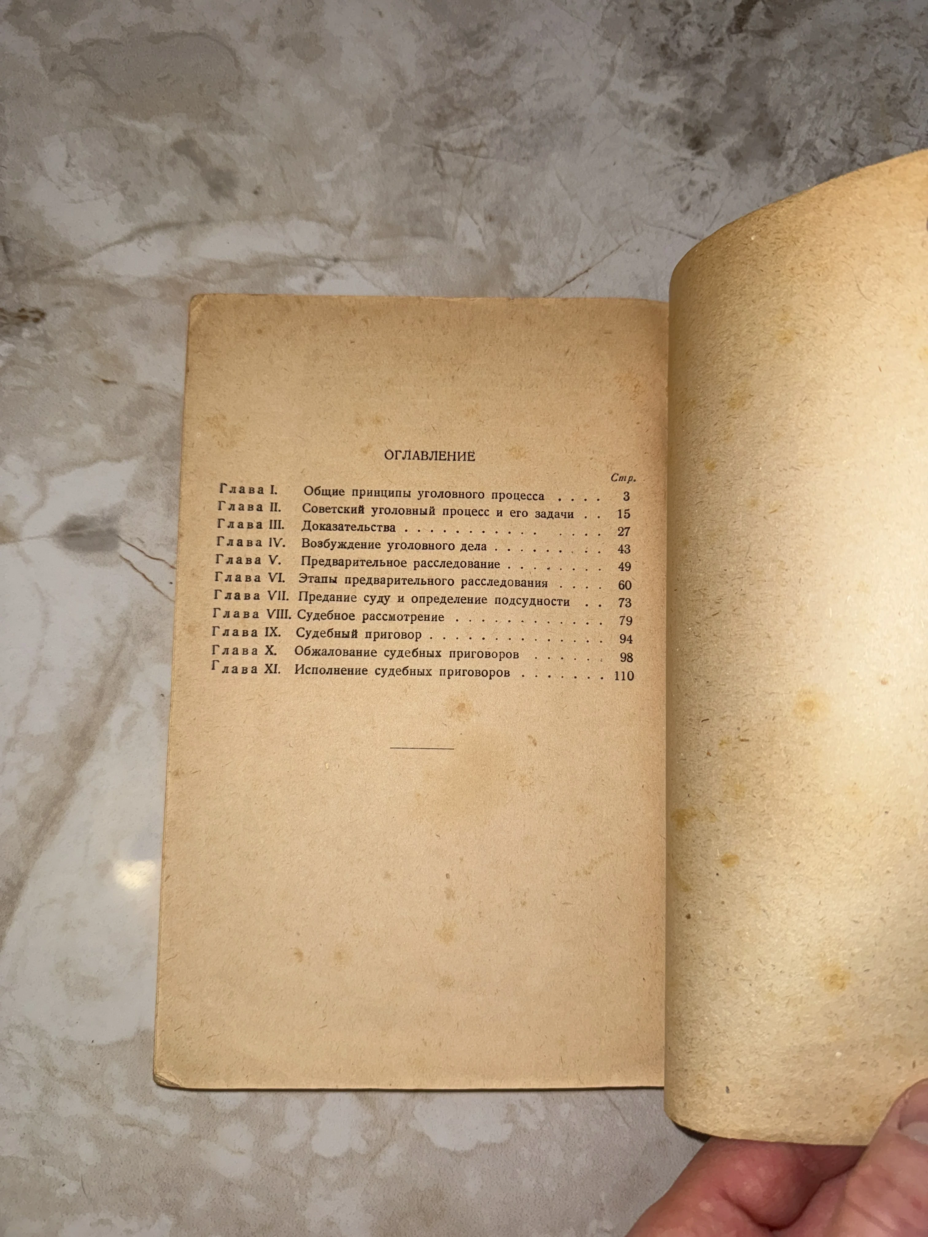 Перед вами аутентичный разворот юридического издания середины XX века, посвященного основам советского правосудия. Благородная патина и характерное пожелтение бумаги подчеркивают историческую ценность документа, охватывающего все этапы судопроизводства тех лет. Настоящая находка для коллекционеров букинистики и исследователей истории права.