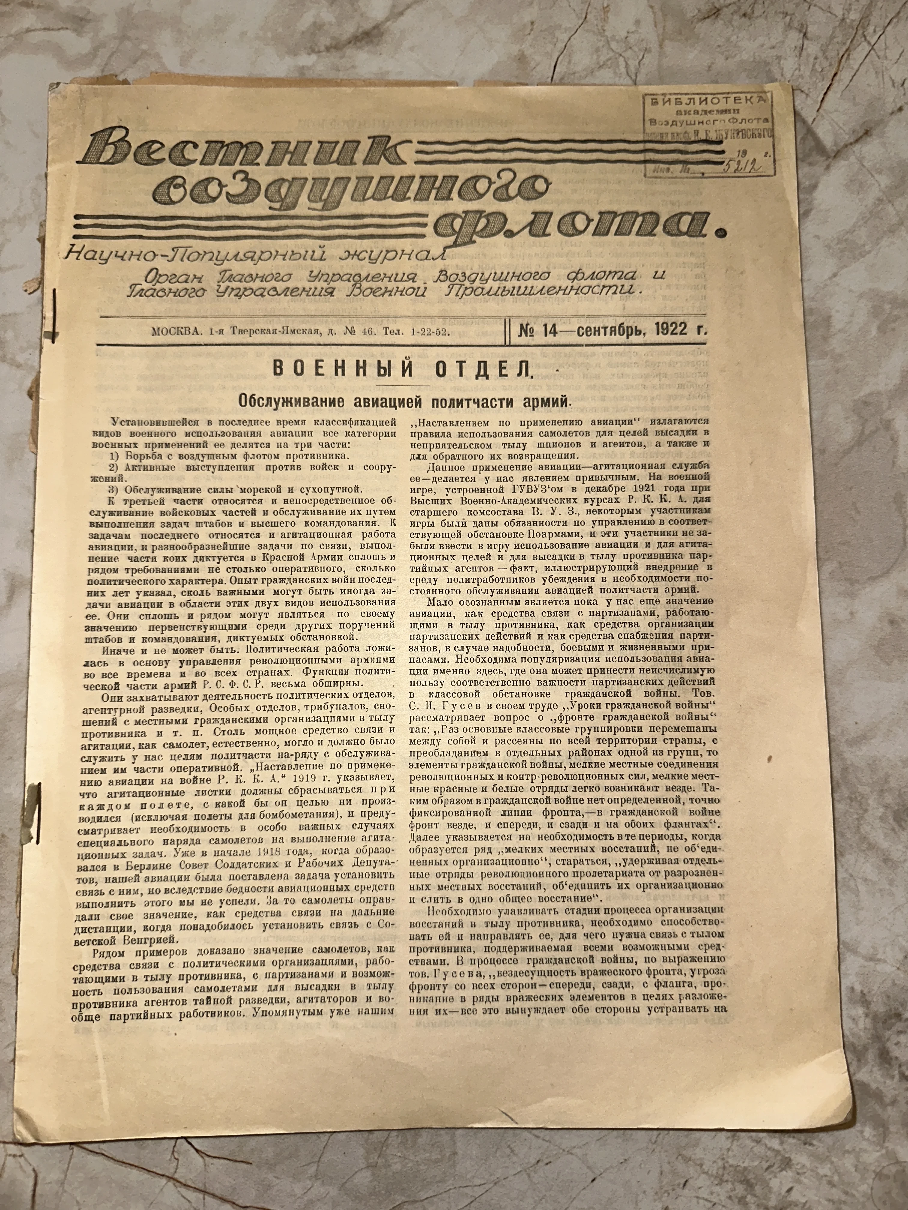 Журнал «Вестник Воздушного Флота», № 14, сентябрь 1922 года