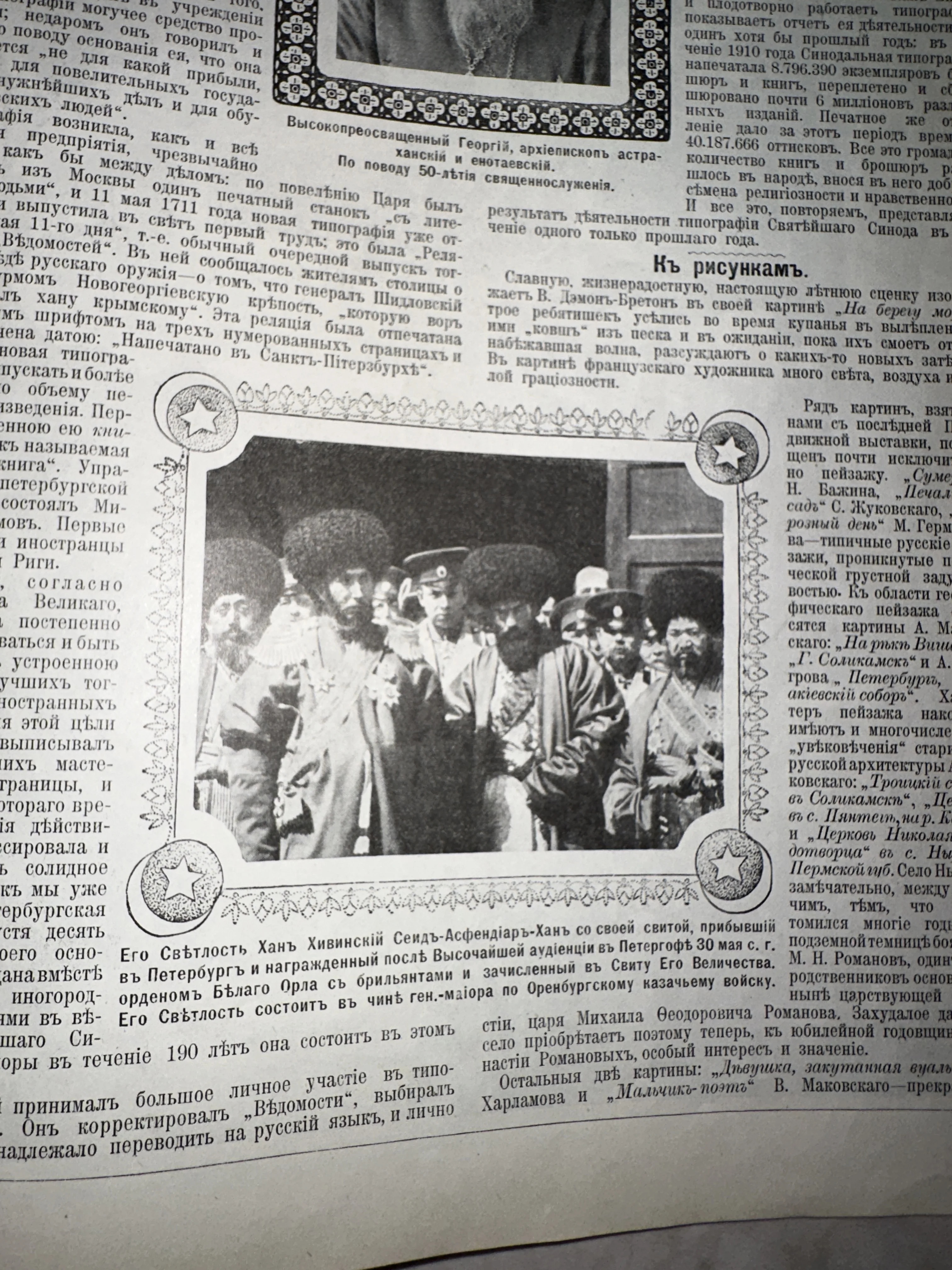 Подлинный фрагмент дореволюционной прессы, описывающий торжественный визит Хивинского хана в столицу империи. Текст в старой орфографии подробно излагает детали аудиенции и награждения хана орденом Белого Орла. Редкий артефакт, передающий атмосферу дипломатических отношений и культурного многообразия Российской империи того времени.