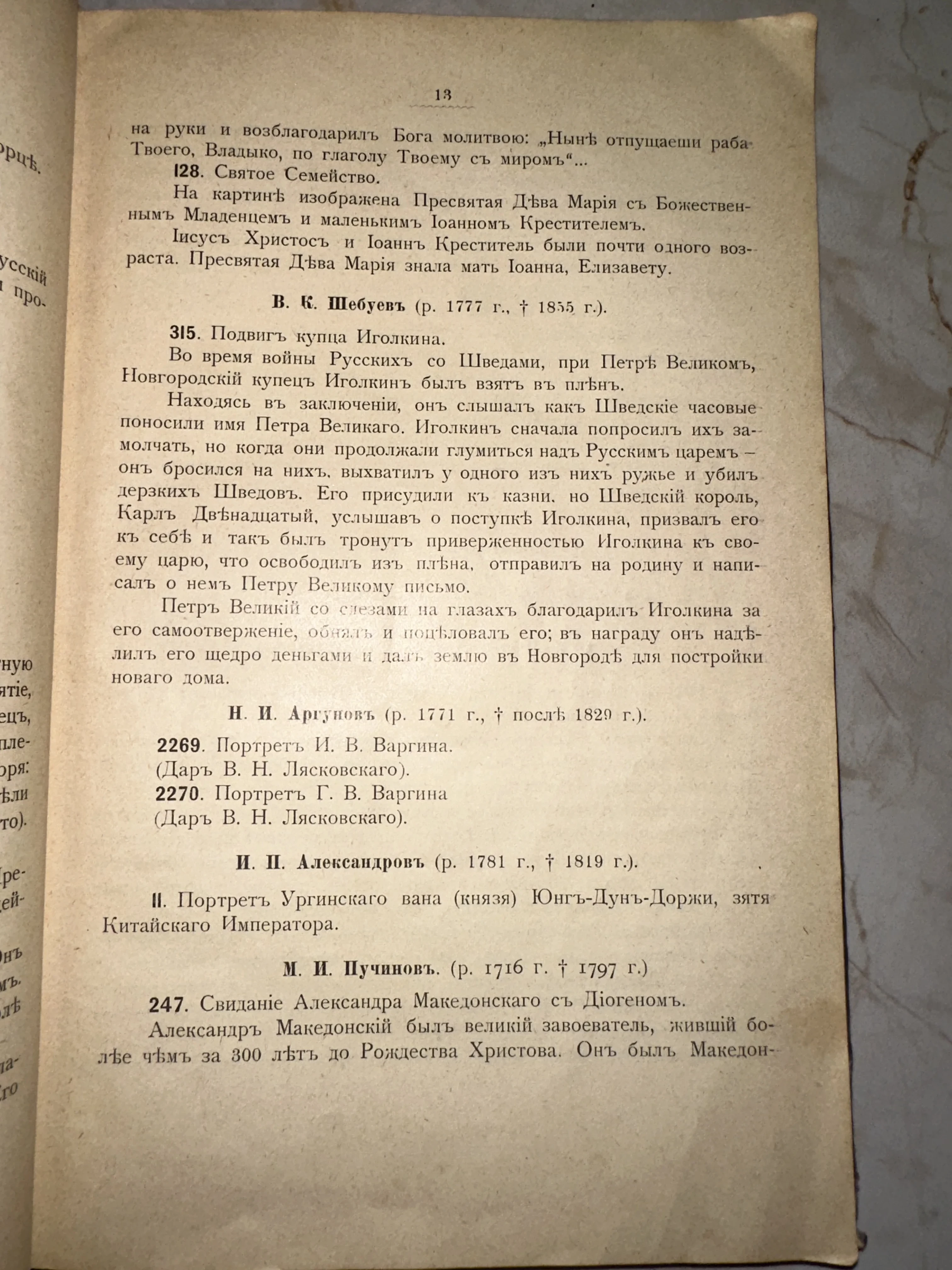 Страница антикварной книги с текстом на дореволюционном русском языке, описывающая подвиг купца Иголкина и произведения известных художников Шебуева и Аргунова.