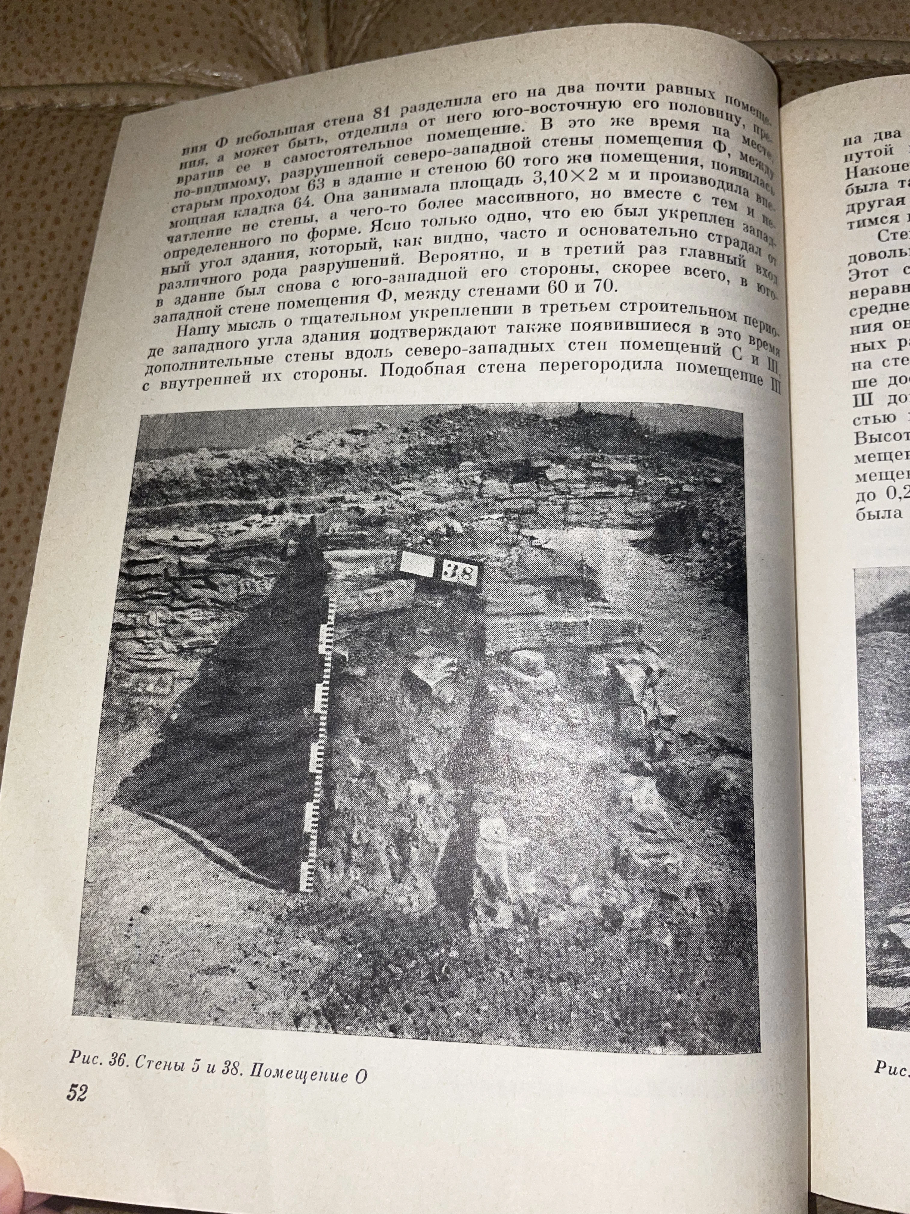 Этот книжный разворот представляет собой детальный отчет об археологических изысканиях, запечатлевший процесс изучения древних каменных кладок. Строгий академический стиль текста в сочетании с документальной фотографией передает атмосферу масштабных научных экспедиций прошлого века. Издание станет ценным дополнением коллекции для тех, кто увлечен историей архитектуры и букинистической классикой.