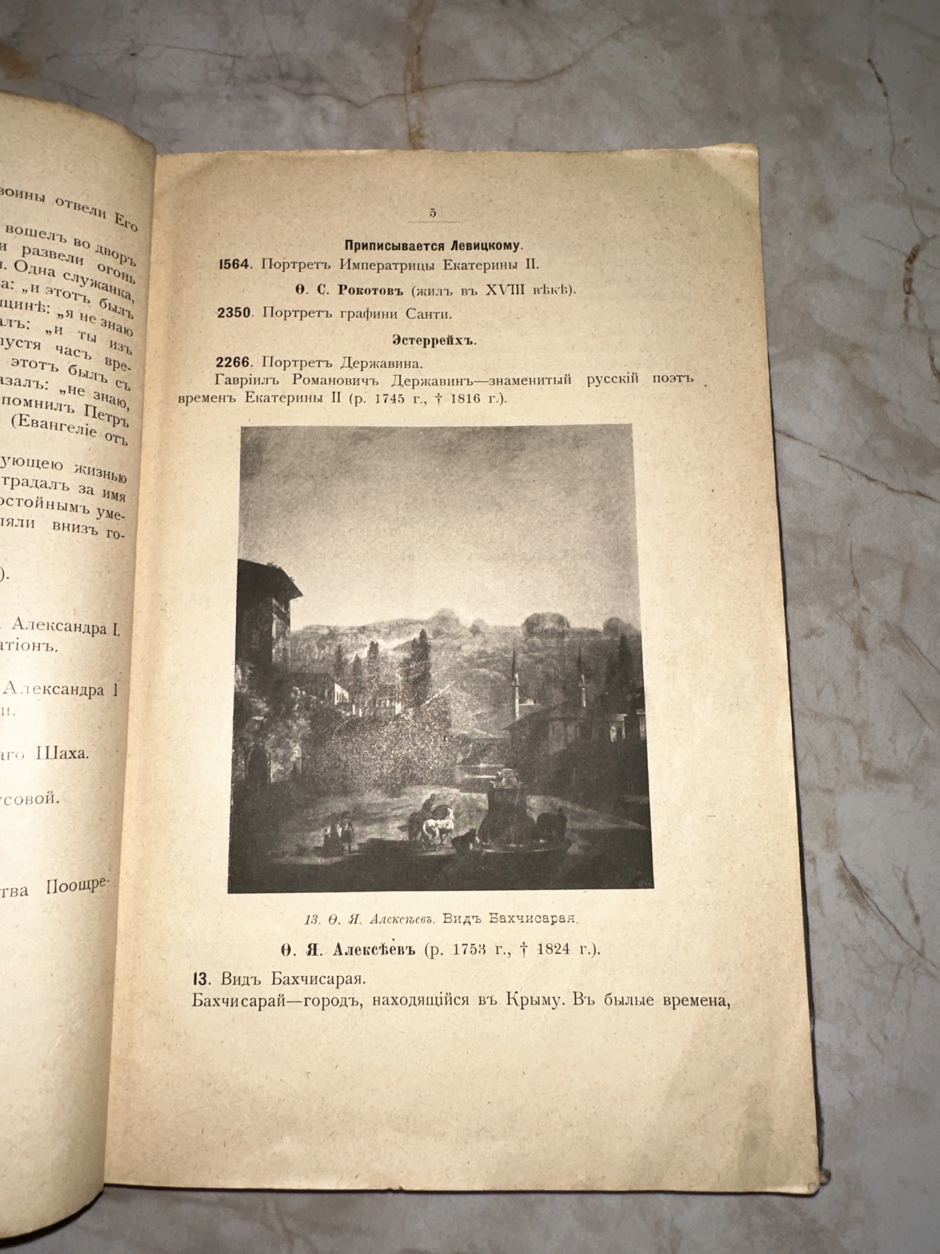 Разворот старинной книги с репродукцией картины Фёдора Алексеева 'Вид Бахчисарая' и списком классических портретов.