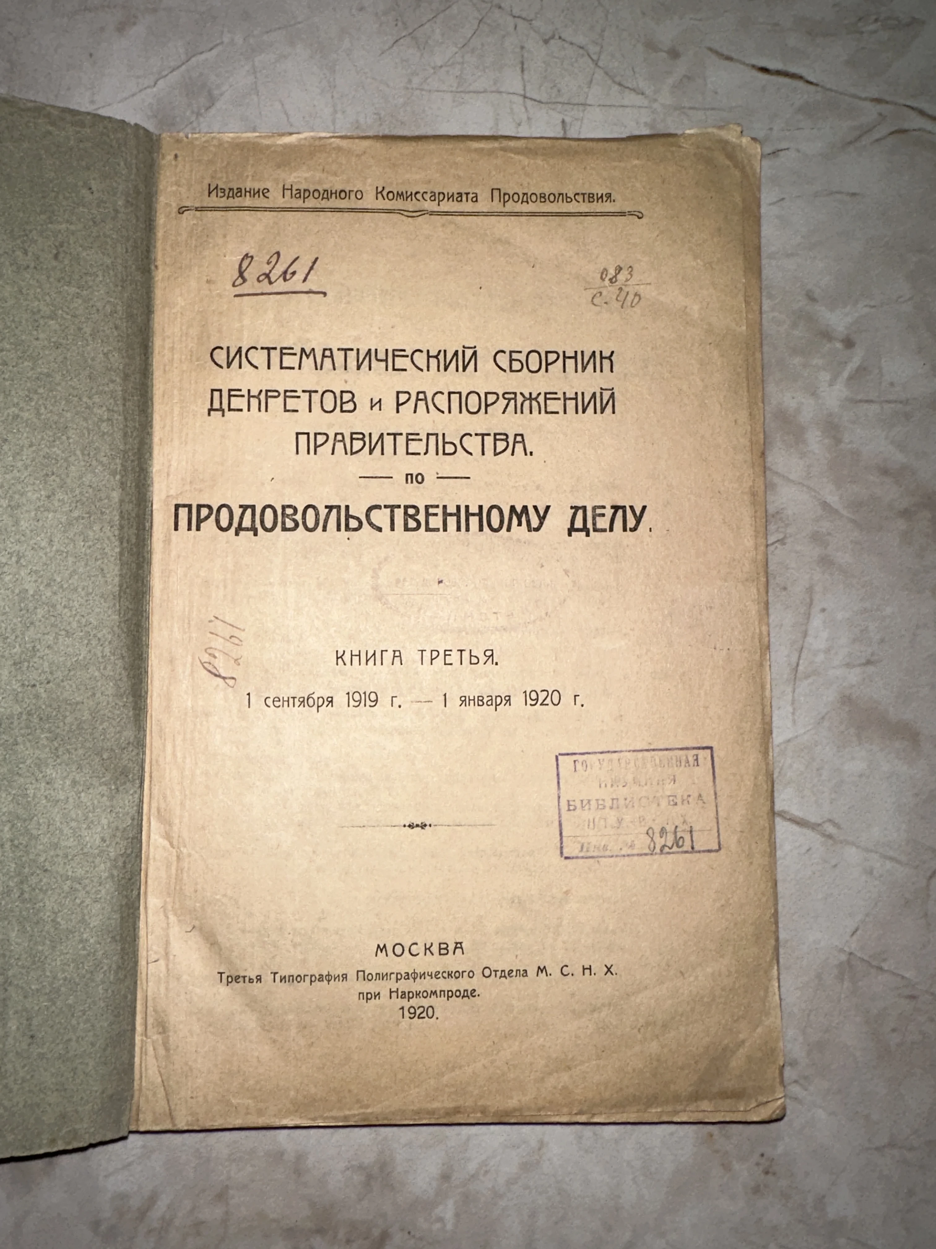 Титульный лист антикварной книги 1920 года 'Систематический сборник декретов и распоряжений правительства по продовольственному делу'.