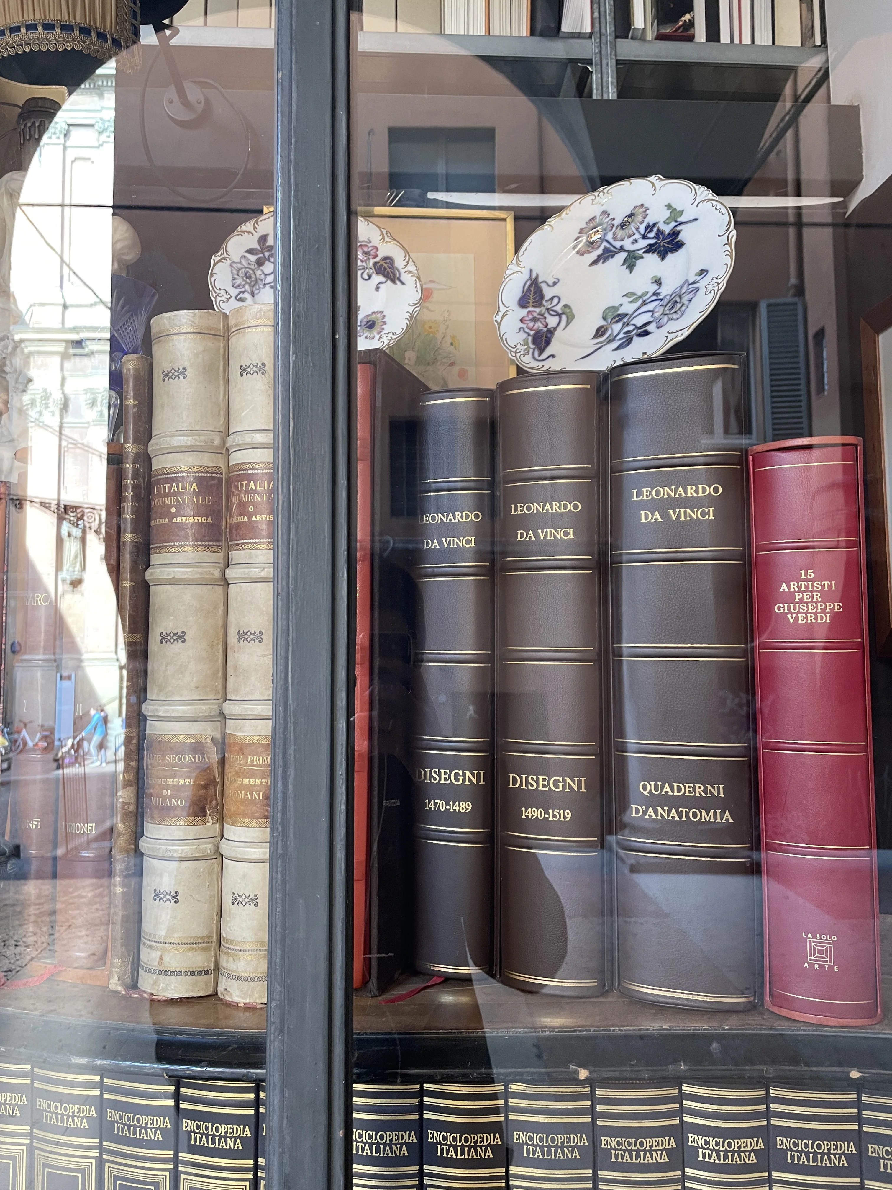 Старинные книги в кожаных переплетах с золотым тиснением на витрине антикварного магазина, включая многотомники Леонардо да Винчи и Итальянскую энциклопедию.