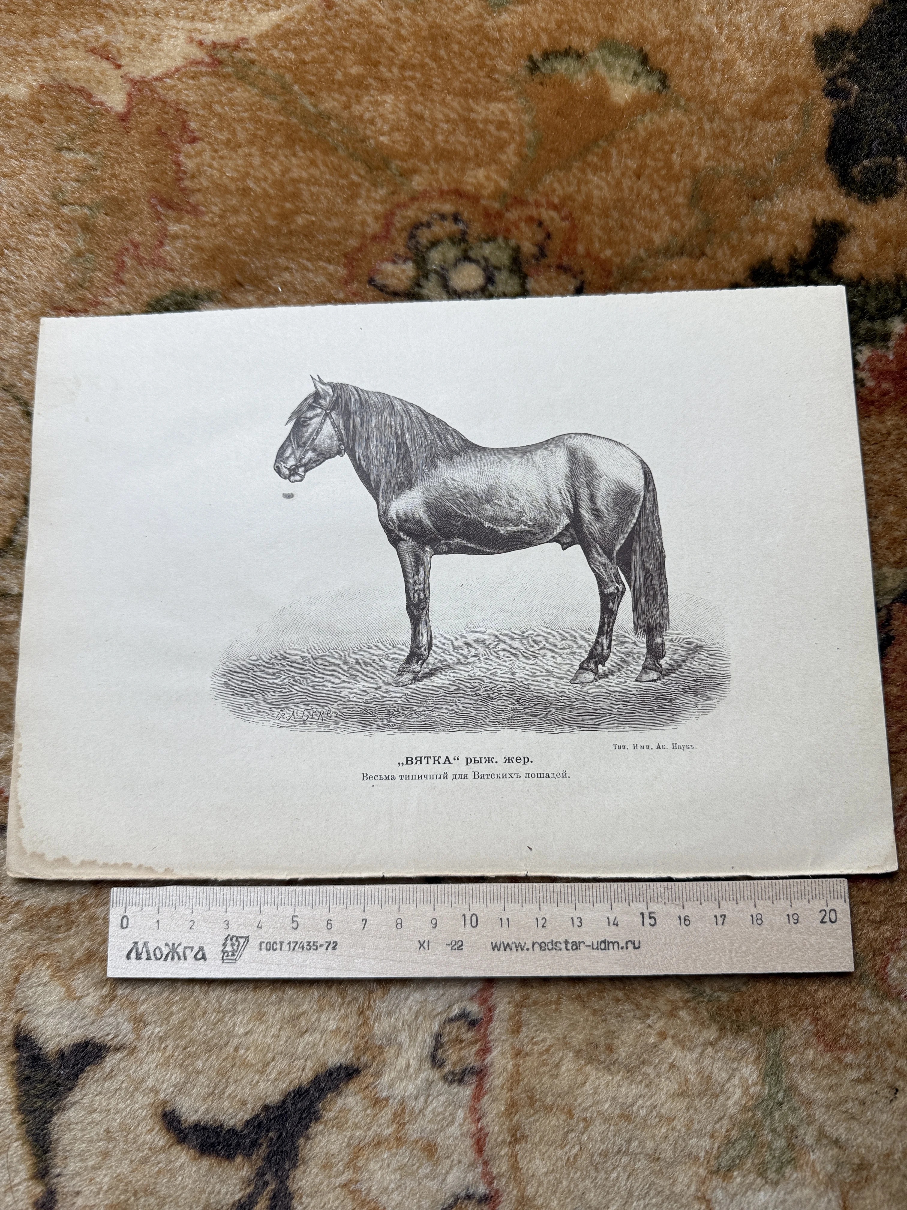 Антикварная гравюра «Вятка»: типичный представитель вятской породы лошадей