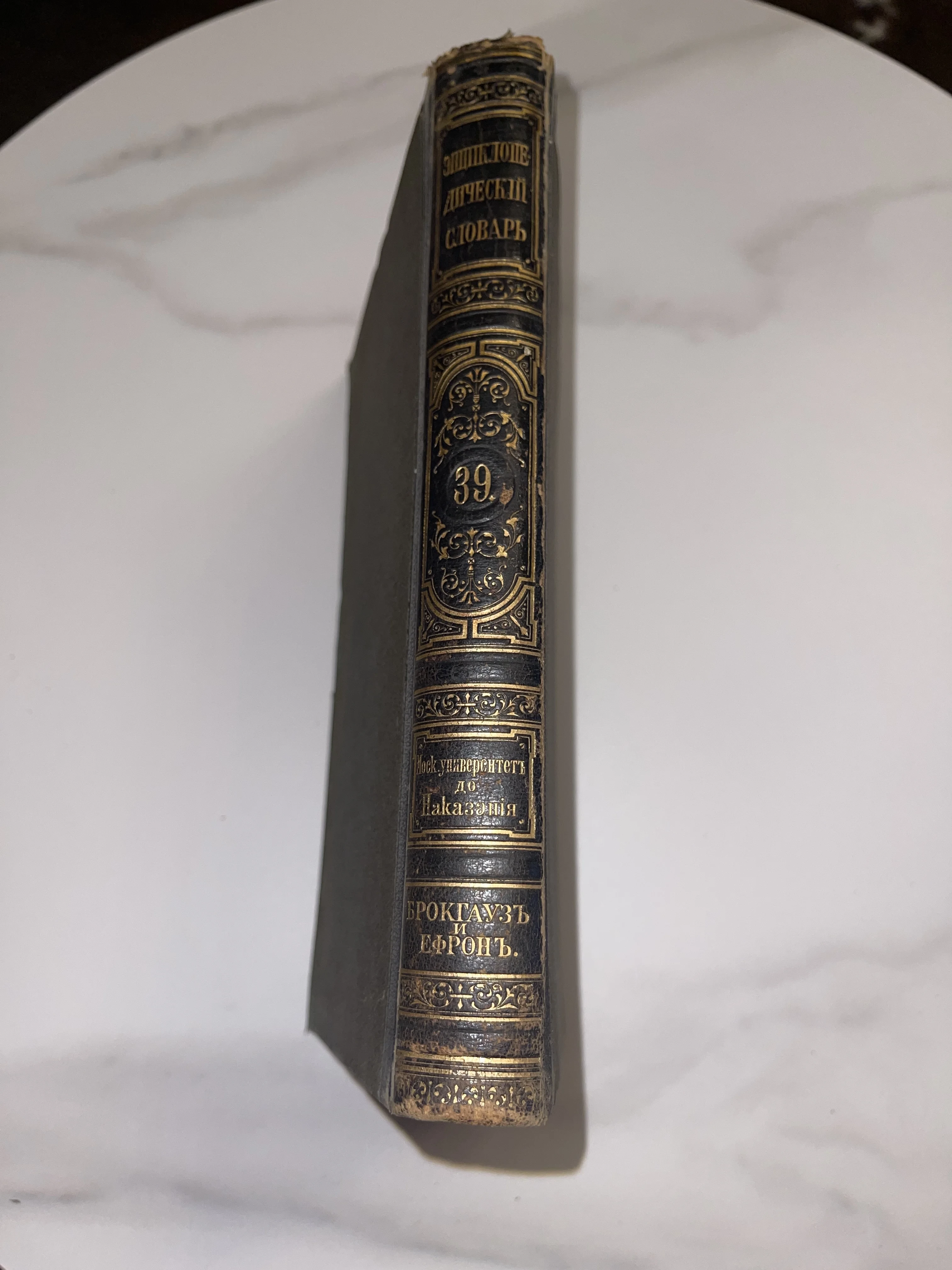 Перед вами легендарный памятник книгоиздания — 39-й том знаменитого словаря Брокгауза и Ефрона. Благородный темный переплет украшен изящным золотым тиснением, сохранившим свой блеск, несмотря на почтенный возраст. Книга обладает той неповторимой энергетикой старины, которая превращает обычную библиотеку в собрание редких артефактов.