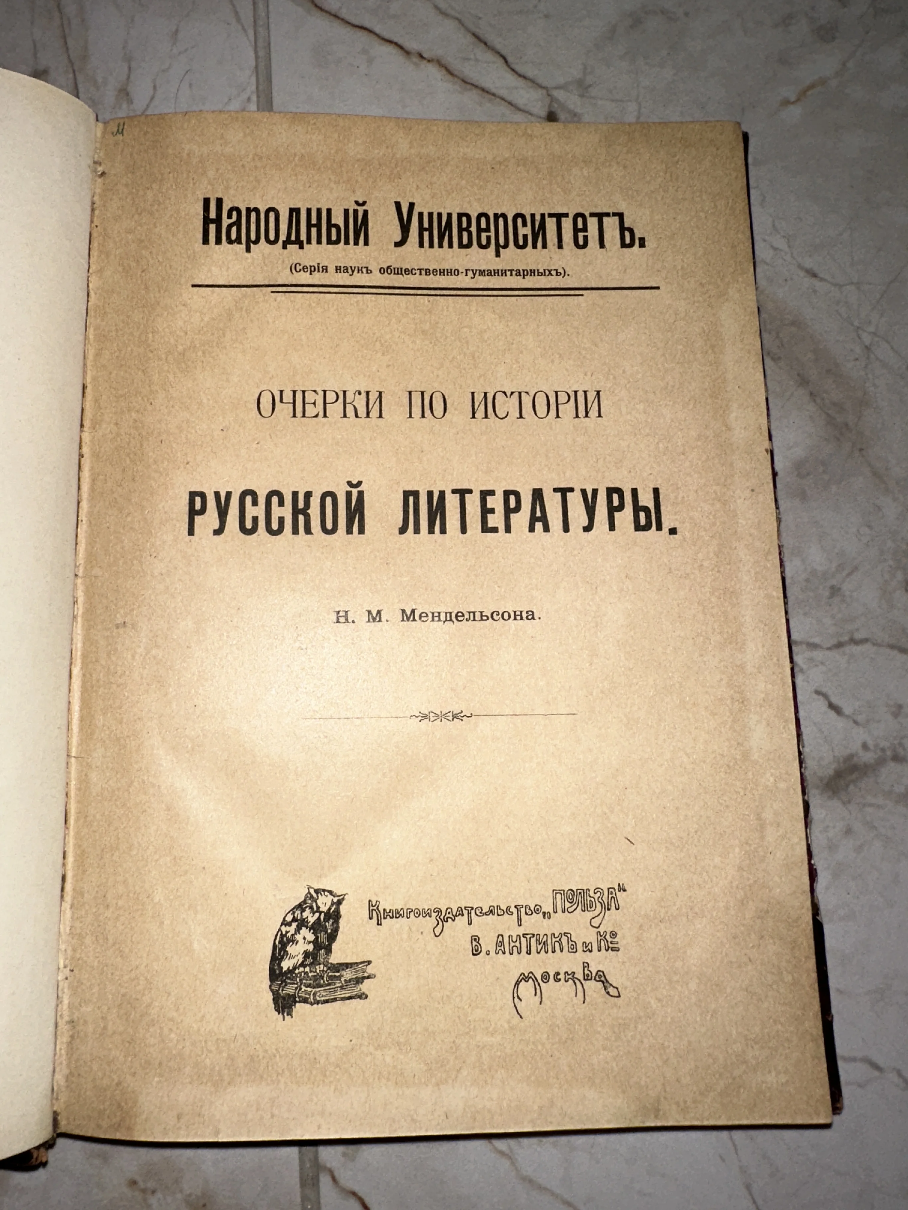 Титульный лист антикварной книги Н. М. Мендельсона «Очерки по истории русской литературы», дореволюционное издание издательства «Польза».