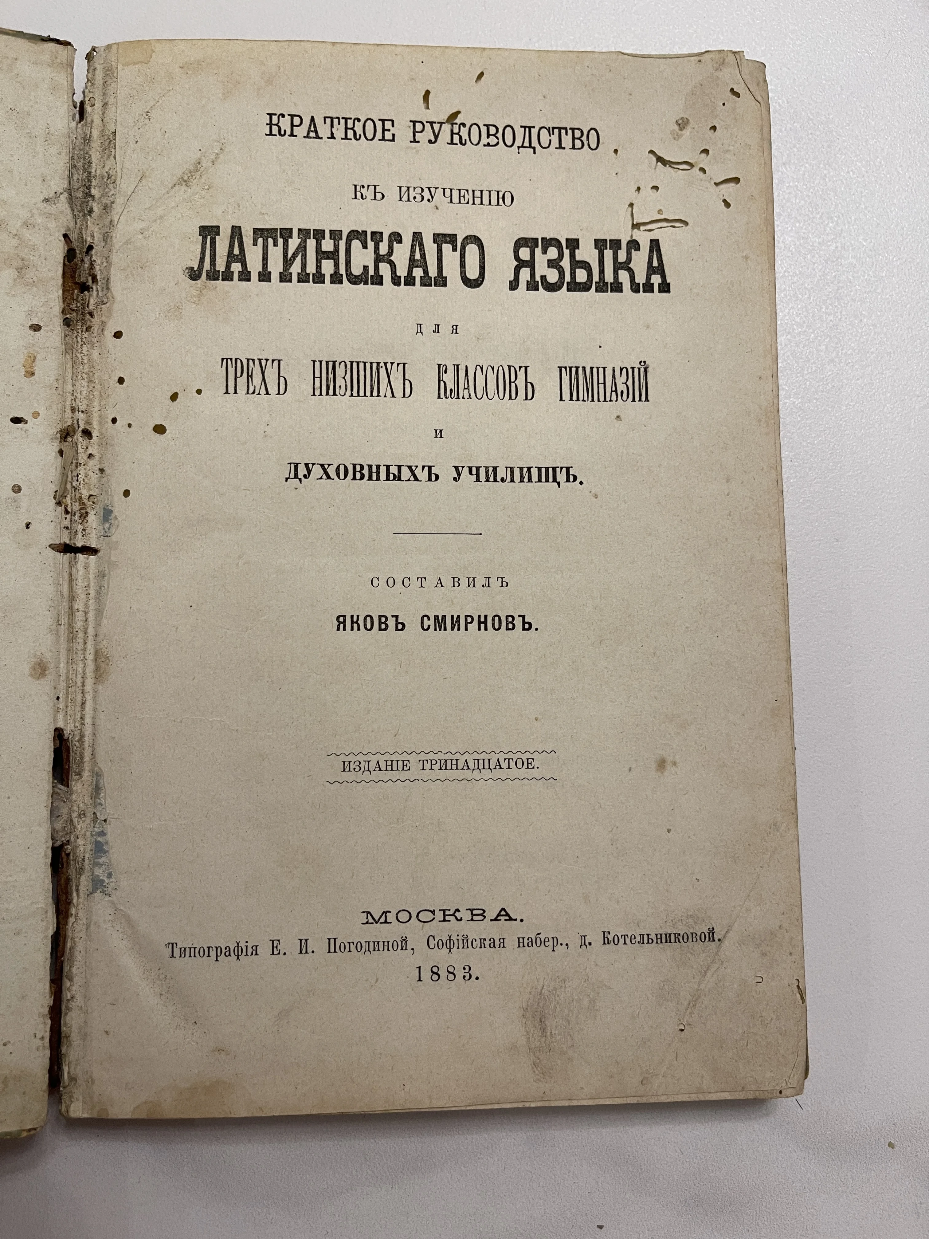 Перед вами редкий экземпляр дореволюционного учебного пособия, по которому постигали азы латыни ученики гимназий и духовных училищ конца XIX века. Страницы хранят на себе благородную патину времени с характерными следами бытования, подчеркивающими аутентичность этого образовательного артефакта. Издание типографии Е. И. Погодиной станет ценным приобретением для коллекционеров старинной литературы и историков педагогики.