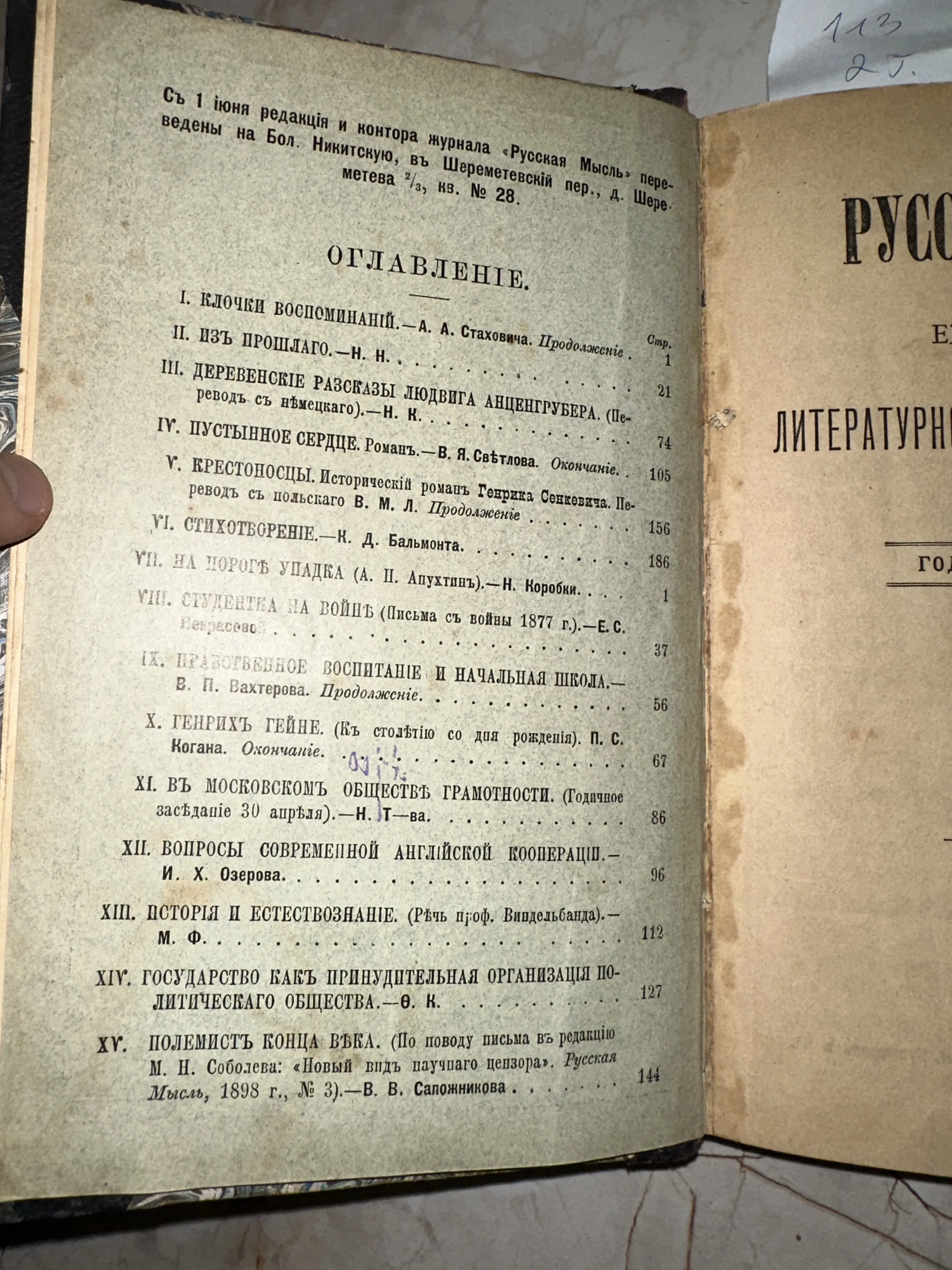 Оглавление журнала «Русская мысль», 1898 год