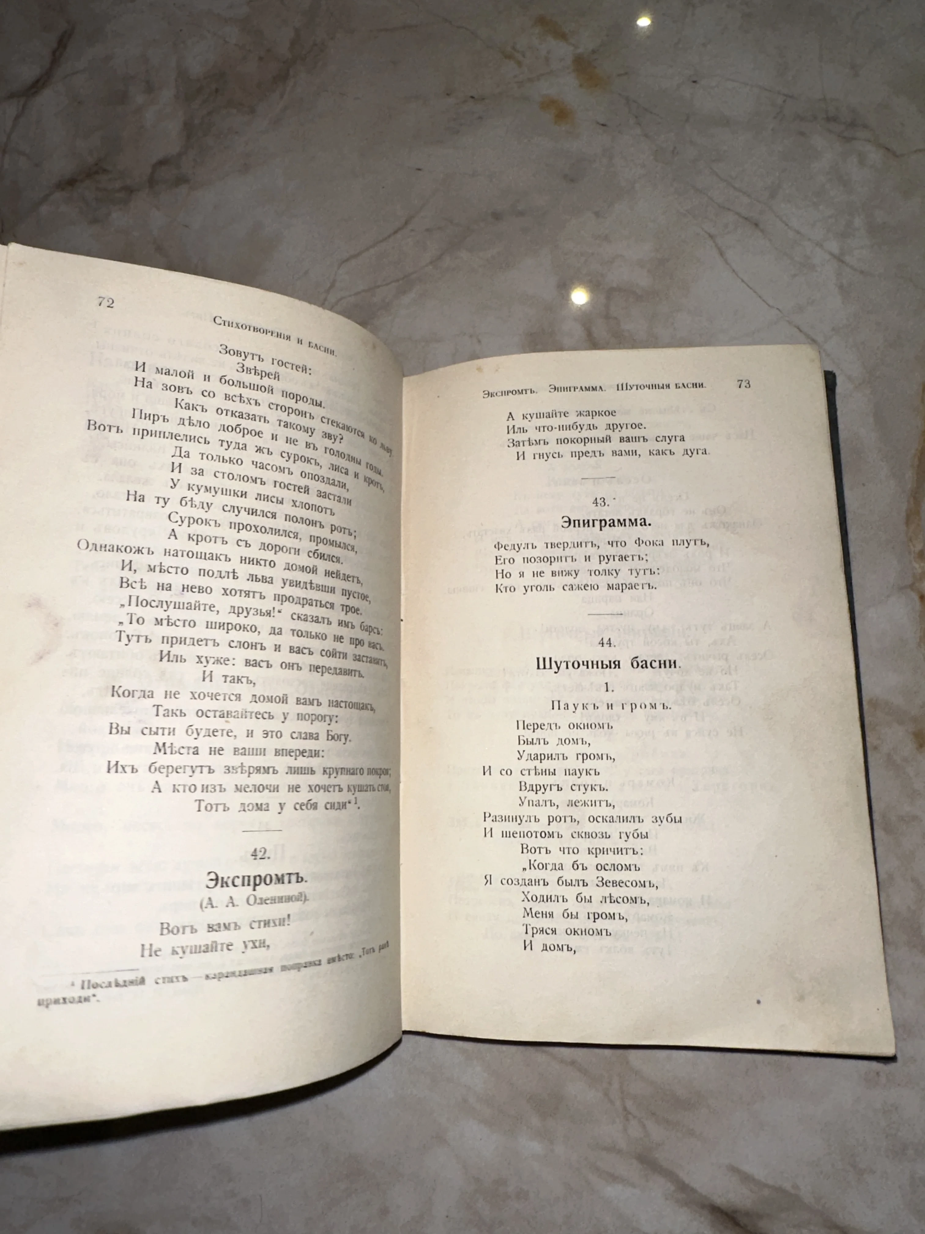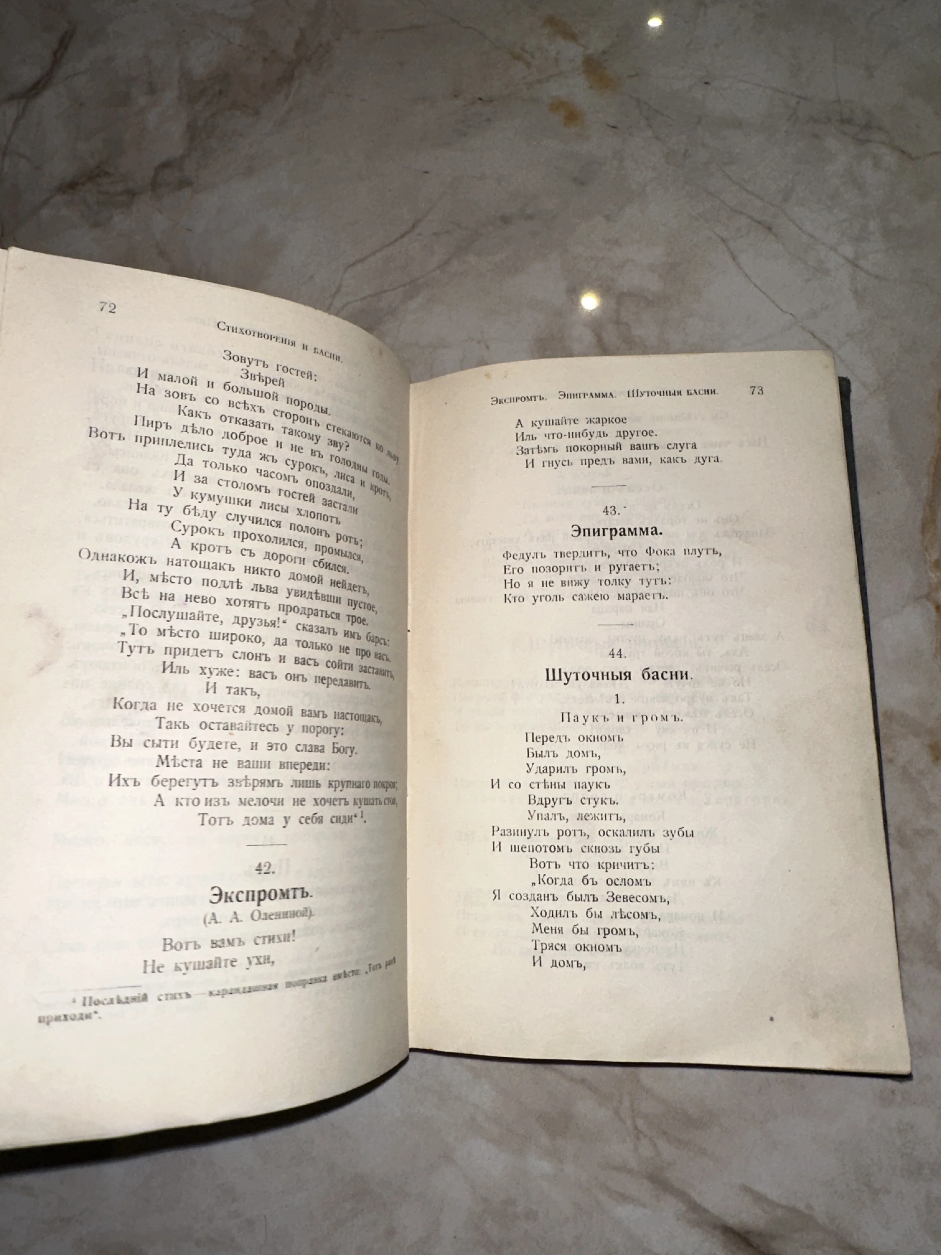Разворот антикварной книги со стихотворениями и баснями, напечатанными в дореволюционной русской орфографии.