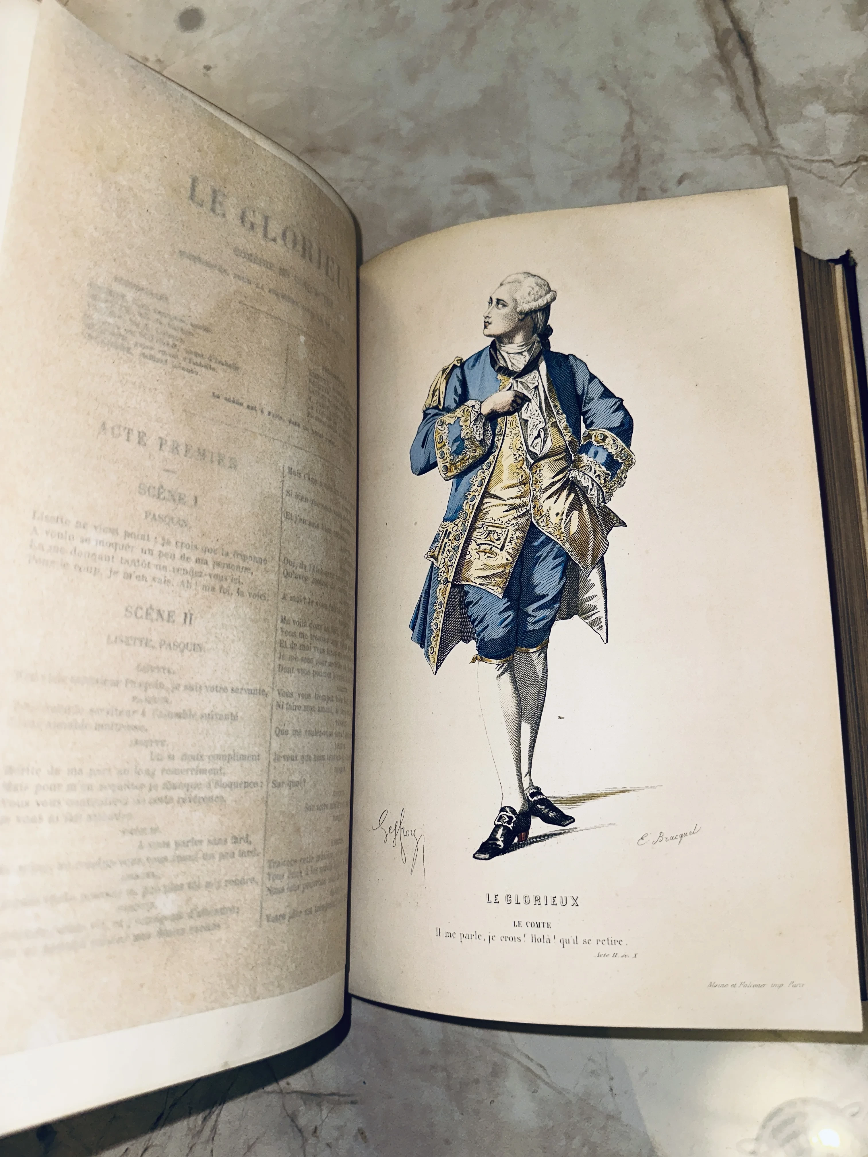Старинное французское издание пьесы «Le Glorieux» с цветной гравюрой