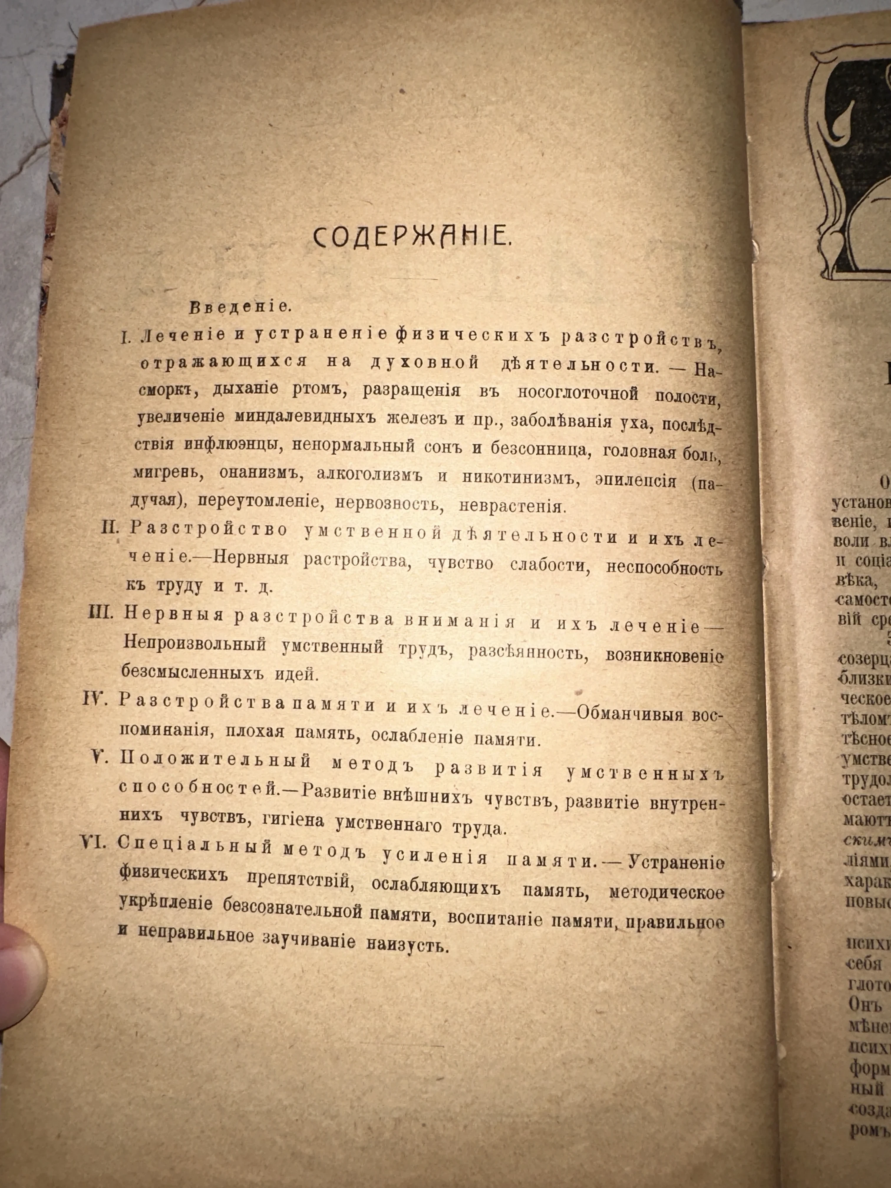 Перед вами подлинный фрагмент истории медицины, напечатанный на характерной пожелтевшей бумаге с использованием дореволюционного алфавита. Текст оглавления охватывает темы психологии и гигиены умственного труда, передавая уникальную атмосферу врачебной мысли рубежа веков. Этот экземпляр станет ценным дополнением к коллекции старинных изданий или тематического декора.
