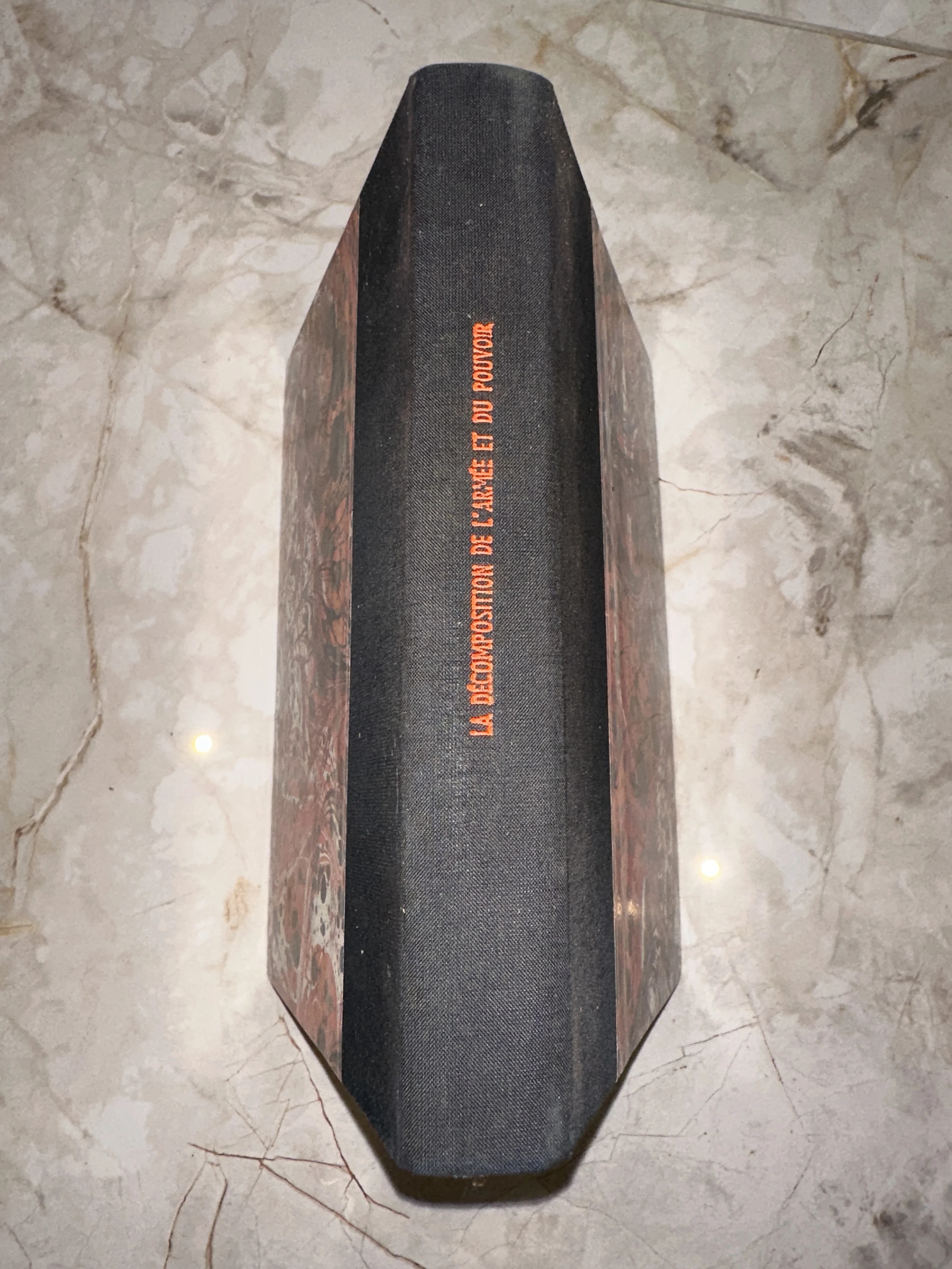 Элегантное издание в комбинированном переплете с классической мраморной бумагой на обложке, подчеркивающей строгость исторического труда. Контрастное оранжевое тиснение на массивном корешке прекрасно сохранилось, придавая книге выразительный коллекционный вид. Это издание станет ценным дополнением библиотеки для тех, кто увлекается политической историей и французской публицистикой.
