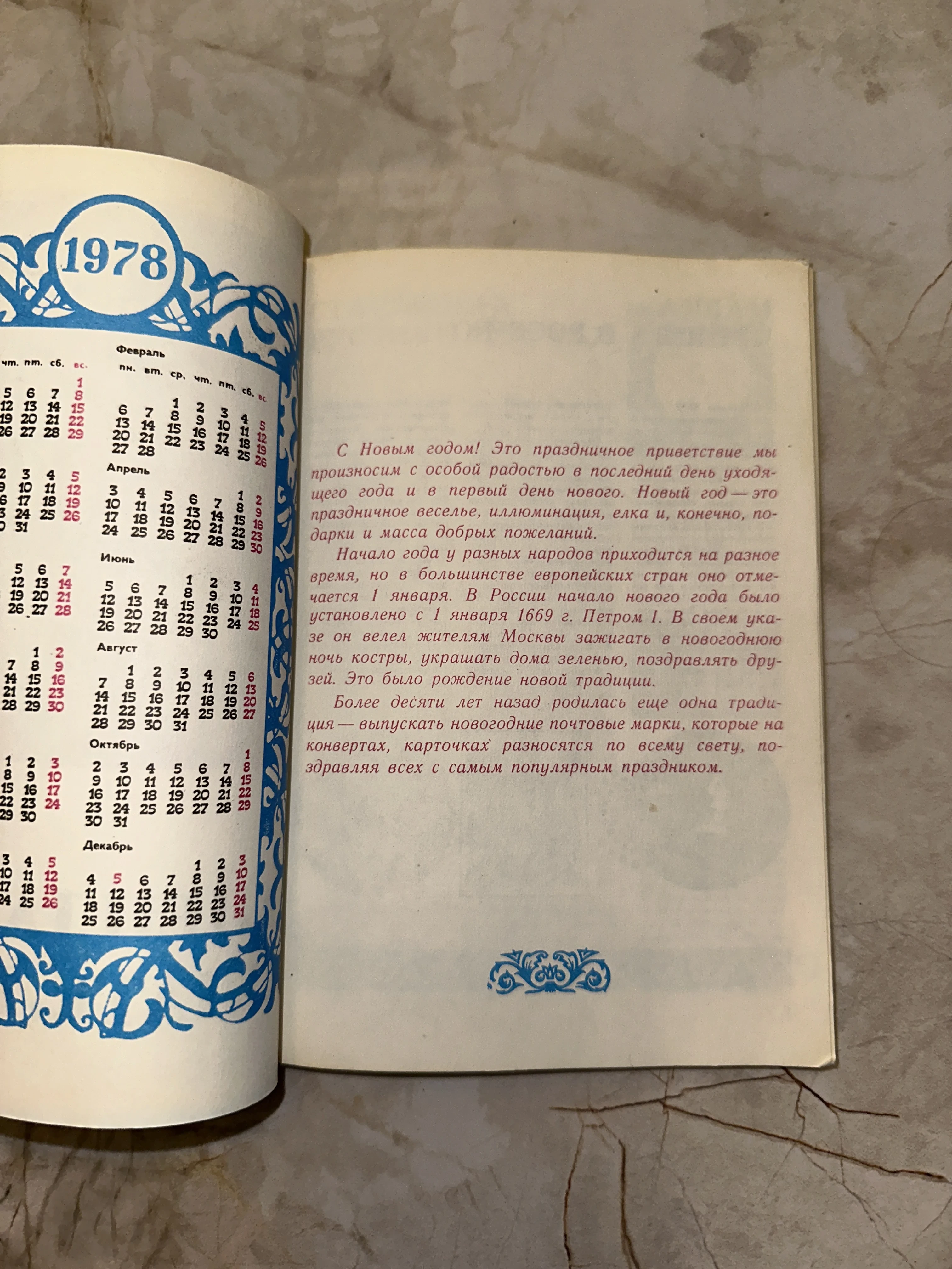 Очаровательный артефакт советской эпохи, сохранивший дух праздничных традиций конца 70-х годов. На развороте представлен календарь на 1978 год и увлекательный рассказ о новогодних указах Петра I, дополненный изящным синим орнаментом. Плотная бумага с легкой патиной времени подчеркивает аутентичность этого коллекционного экземпляра.