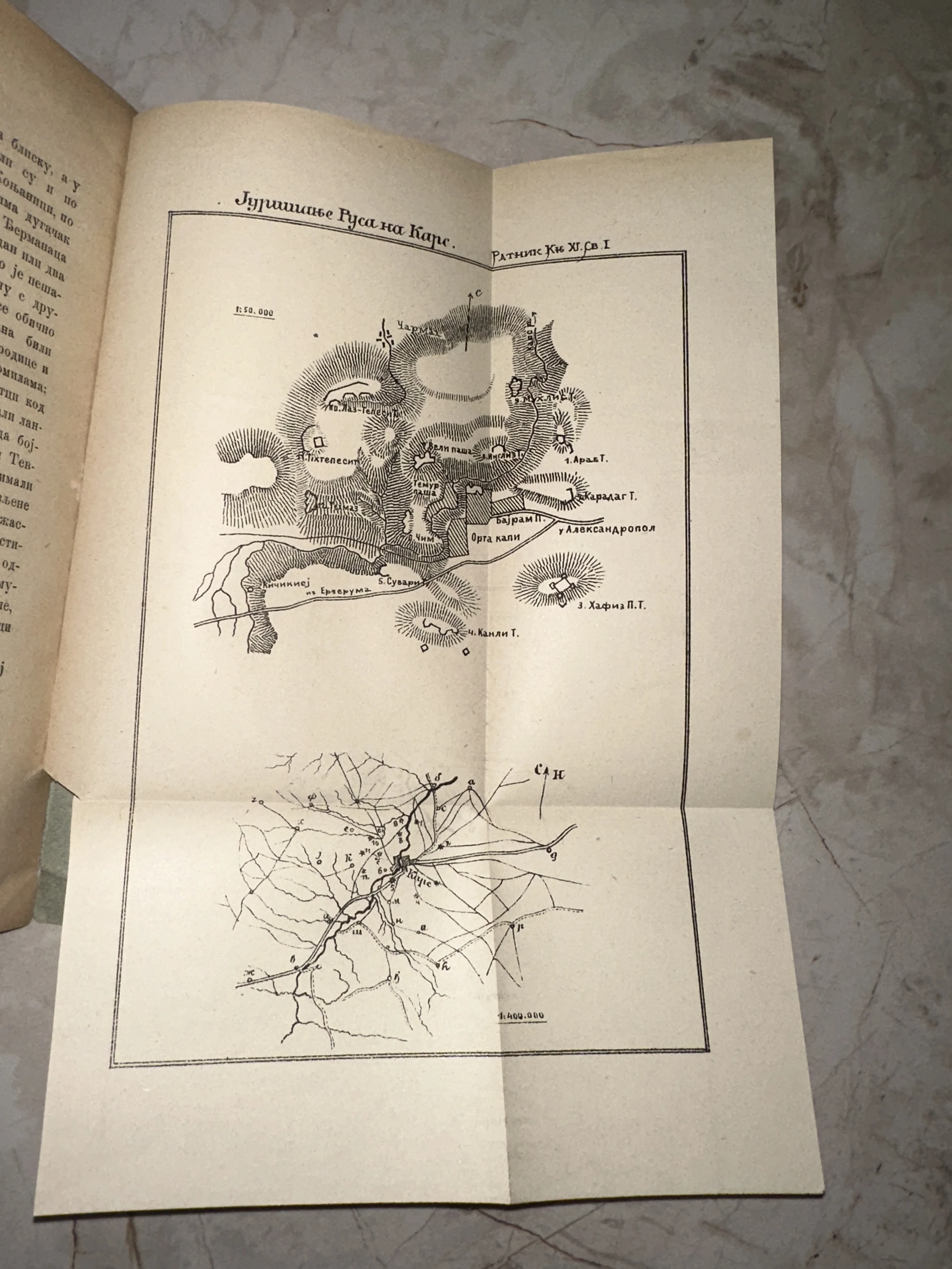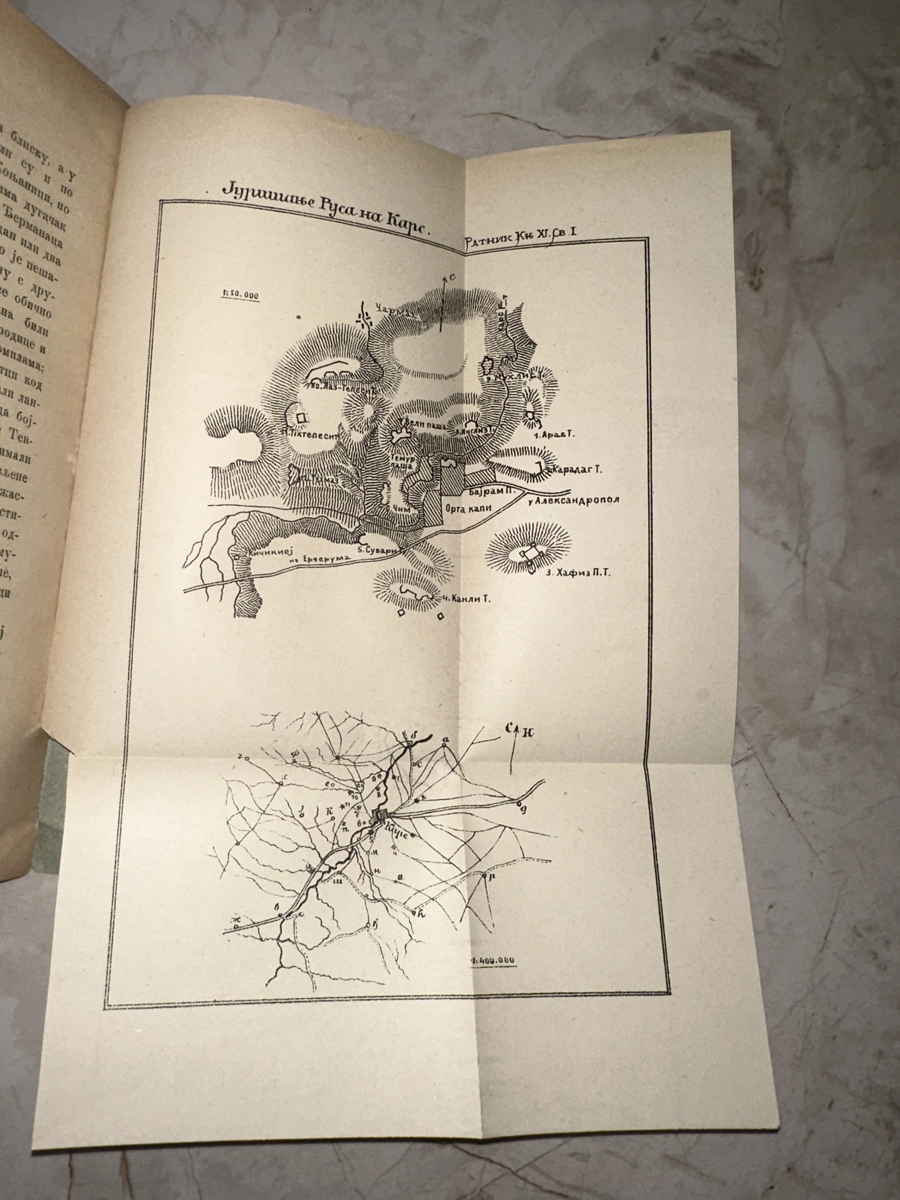 Уникальный документальный вкладыш, детально воссоздающий стратегию исторического сражения за Карс. На пожелтевшей бумаге с филигранной точностью нанесены укрепления и рельеф местности, передающие дух великих военных походов прошлого. Прекрасная сохранность линий и естественное патинирование бумаги делают этот экземпляр ценным приобретением для ценителей военной истории.