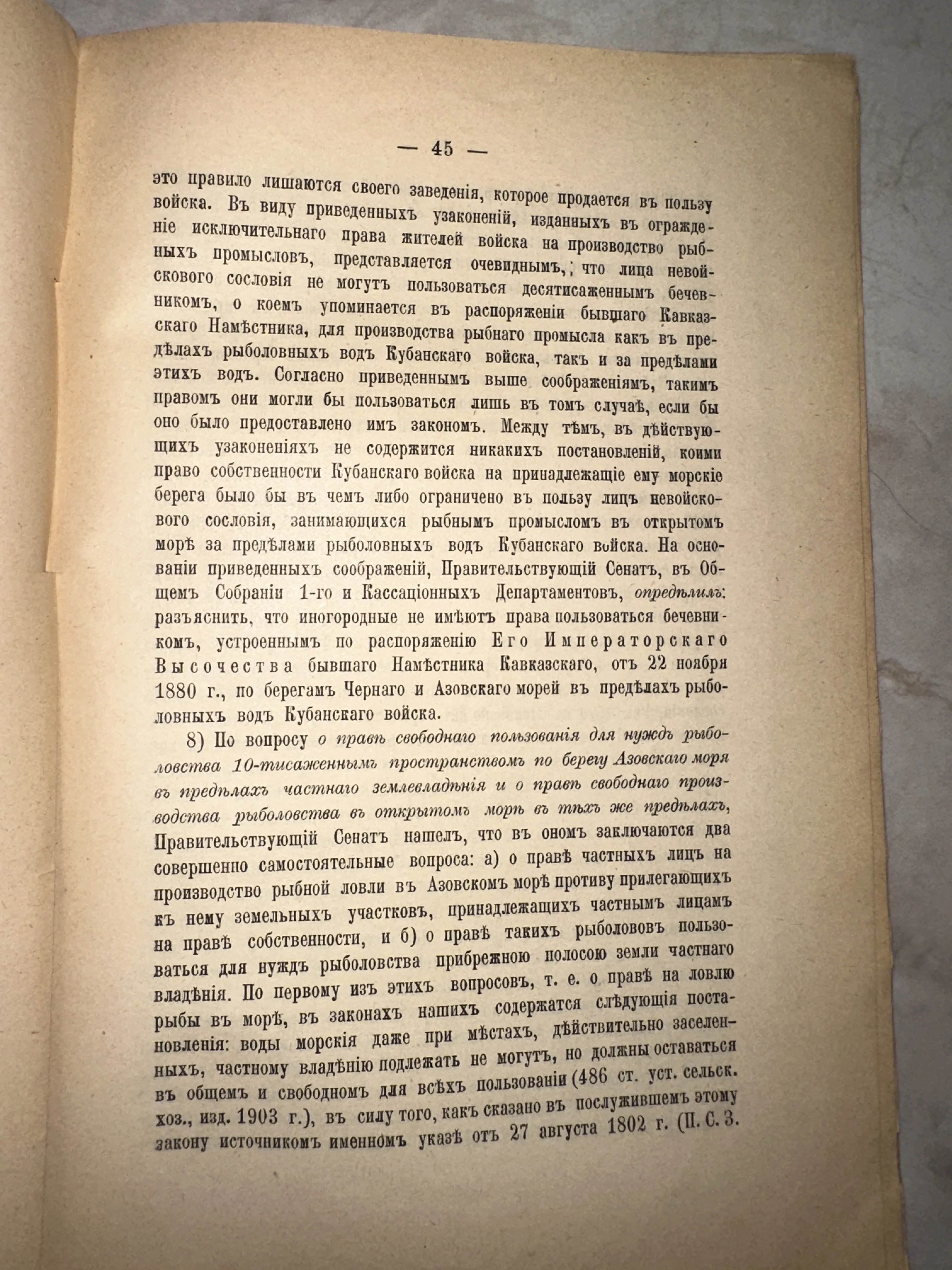 Страница антикварной книги с дореволюционным текстом о правилах рыбной ловли в Азовском и Черном морях.