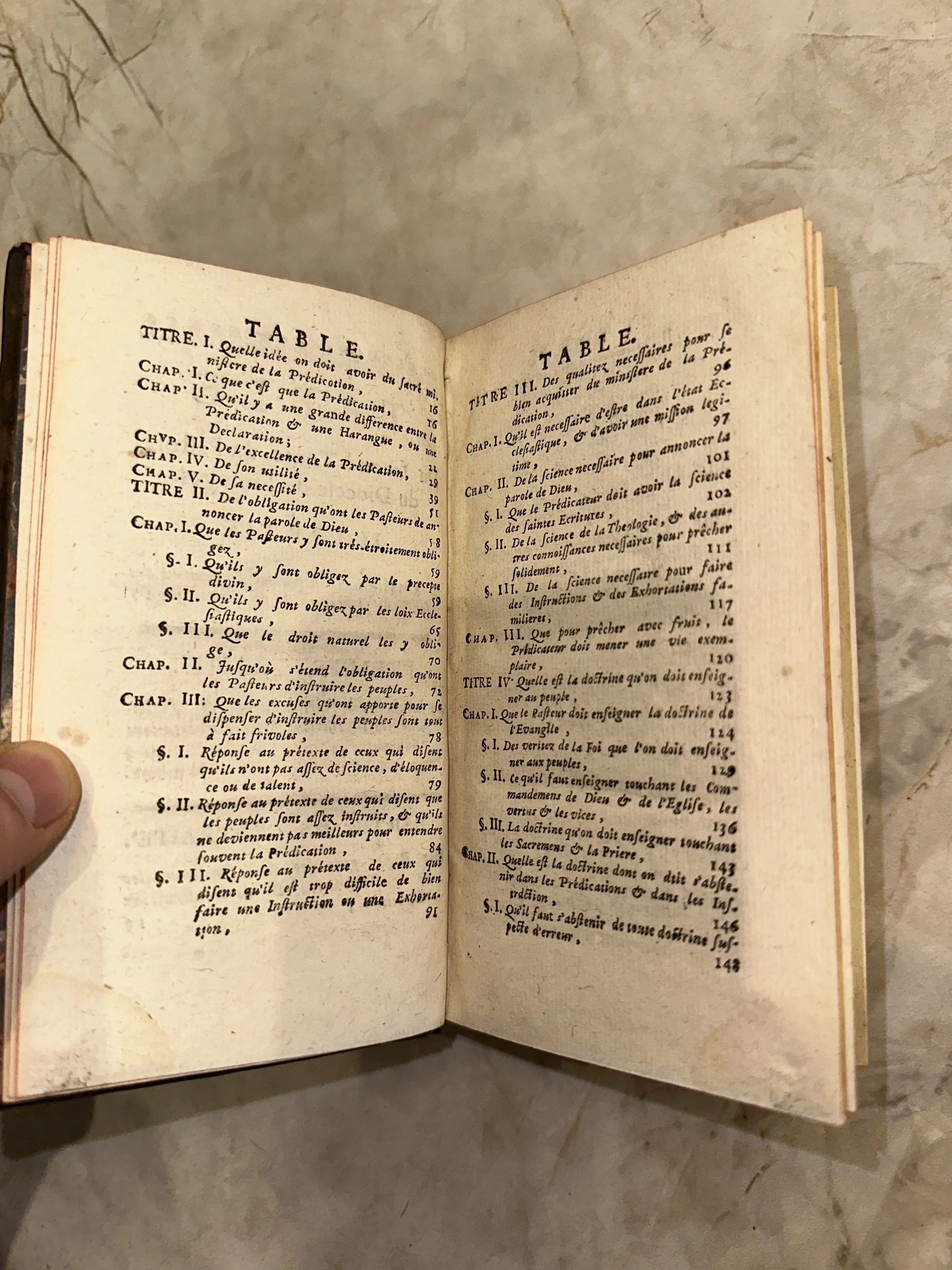 Элегантный разворот французского богословского трактата, сохранивший живое дыхание истории в каждом оттиске шрифта. Плотная бумага с благородным пожелтением и характерными следами времени подчеркивает аутентичность этого редкого экземпляра. Четкая верстка и детальное оглавление делают эту книгу ценным приобретением для коллекционера европейской старины.