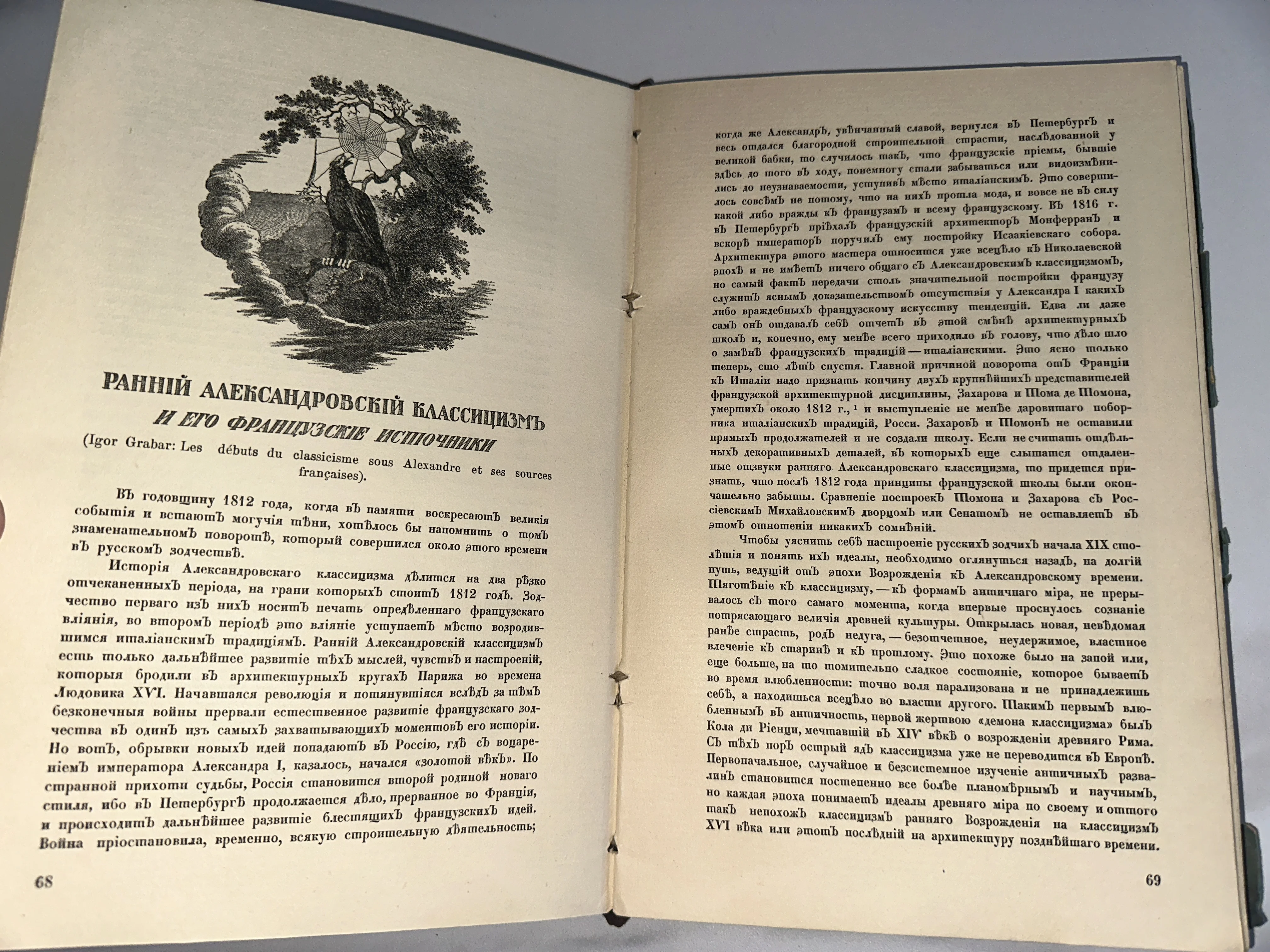 Уникальный разворот из исторического труда Игоря Грабаря, посвященного эстетике александровского классицизма. Страницы из плотной бумаги сохранили четкость печати и художественную виньетку, приглашая читателя погрузиться в атмосферу «золотого века» русской архитектуры.