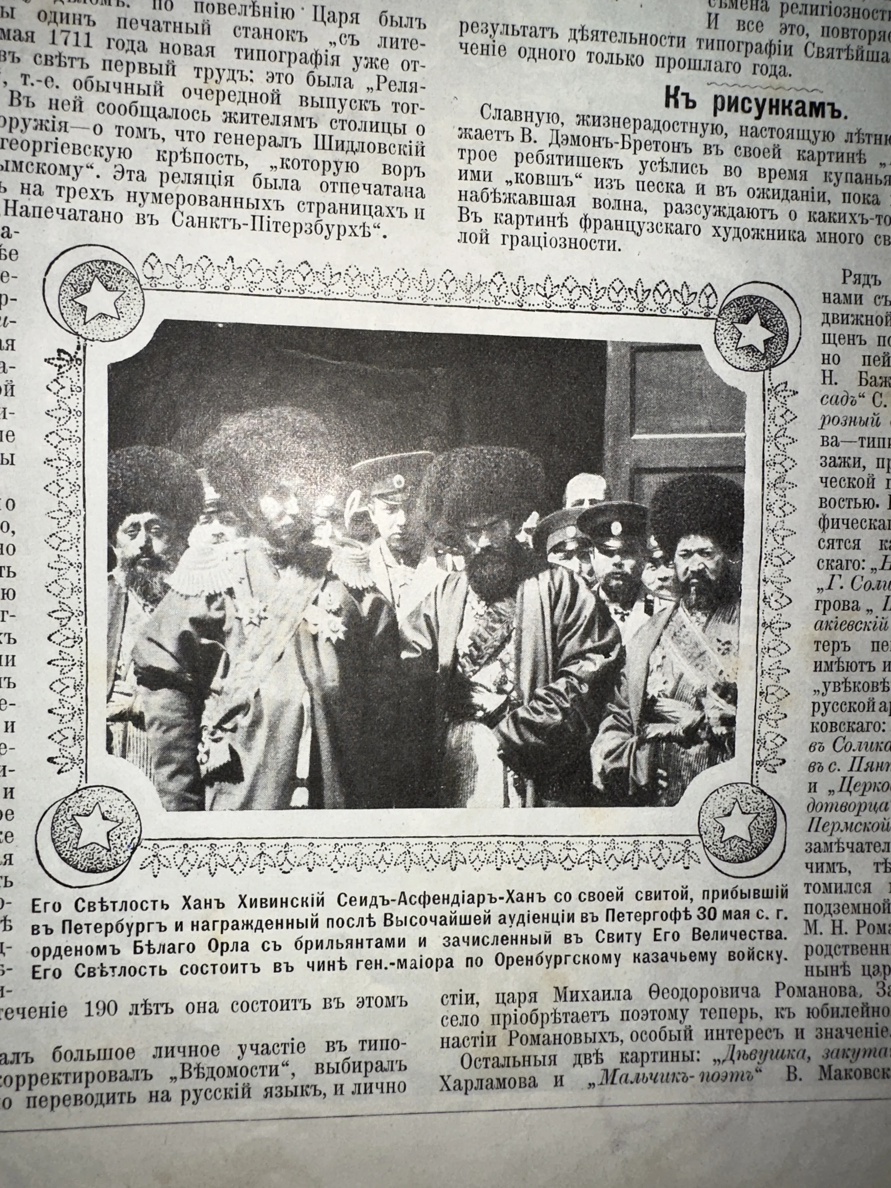 Уникальный фрагмент дореволюционной прессы, запечатлевший исторический момент визита правителя Хивинского ханства к императорскому двору. На снимке детально видны колоритные черты восточной знати и парадные мундиры, а дореволюционная орфография текста придает предмету особую документальную ценность. Прекрасный экземпляр для частной коллекции, отражающий дипломатическую эстетику Российской империи начала XX века.
