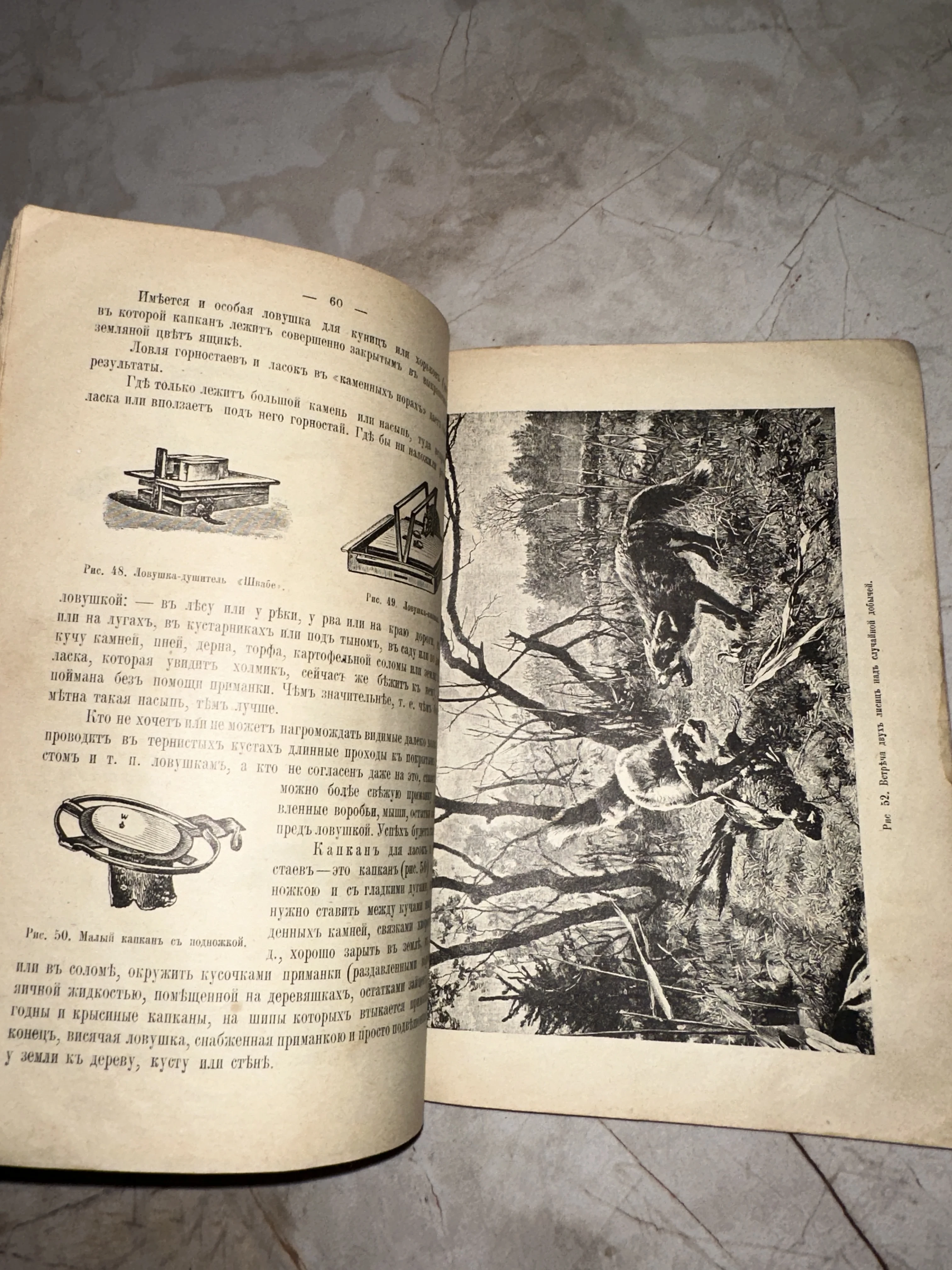 Уникальный фрагмент охотничьего пособия начала XX века, сохранивший дух промысловой старины. На страницах представлены детальные схемы ловушек и выразительная гравюра, запечатлевшая драматичный момент из жизни лесных хищников. Коллекционное состояние бумаги и характерный дореволюционный шрифт подчеркивают историческую ценность издания.