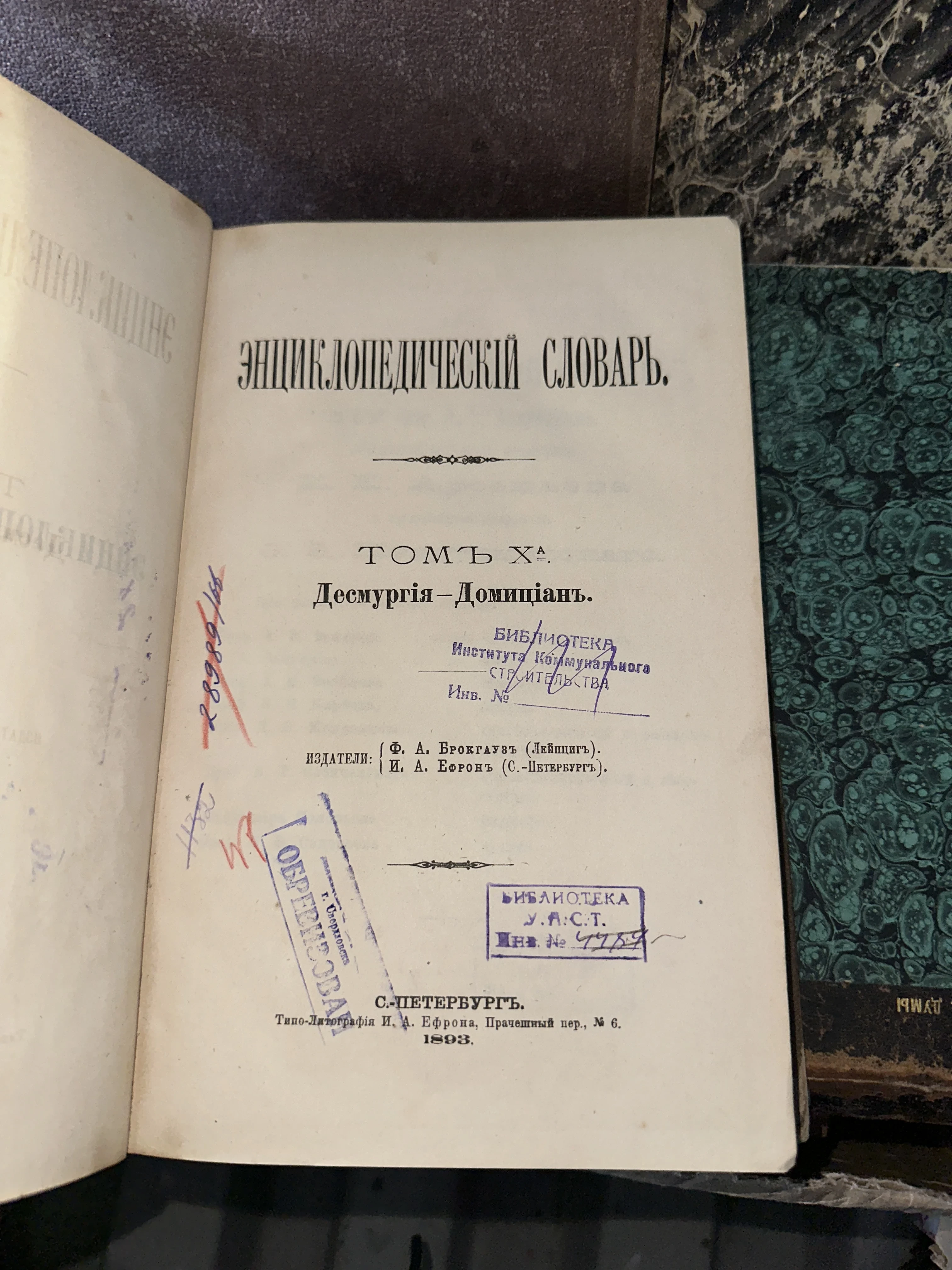 Перед вами титульный лист легендарного десятого тома словаря Брокгауза и Ефрона, напечатанный в Санкт-Петербурге более 130 лет назад. Многочисленные библиотечные печати и инвентарные номера создают уникальный провенанс, рассказывая историю странствий книги по фондам институтов. Благородная патина времени на бумаге и классическая типографика XIX века делают этот экземпляр ценным объектом для коллекционеров и любителей академической старины.