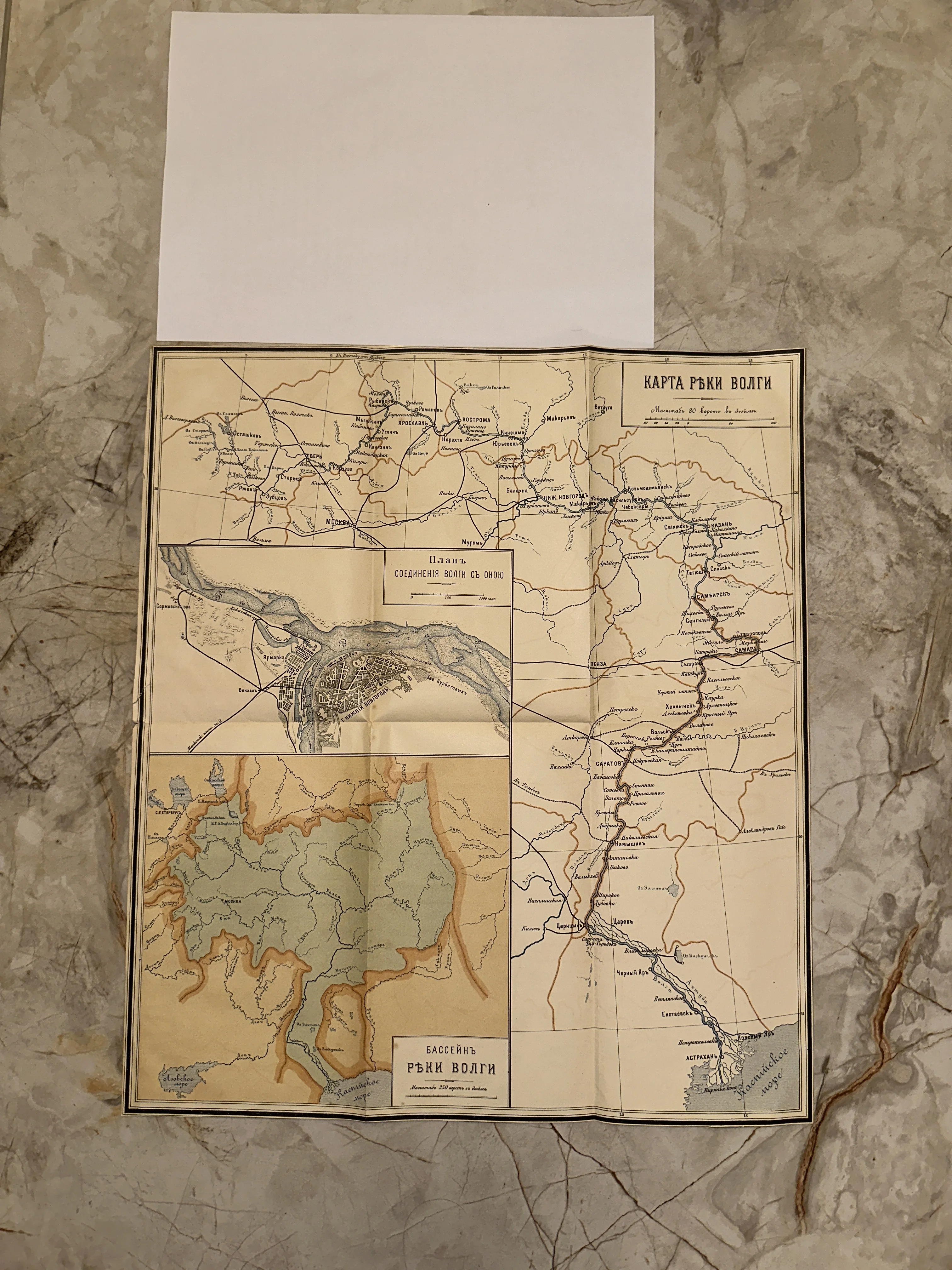 Старинная географическая карта реки Волги с дореволюционными названиями городов и планом слияния с Окой на пожелтевшей бумаге.