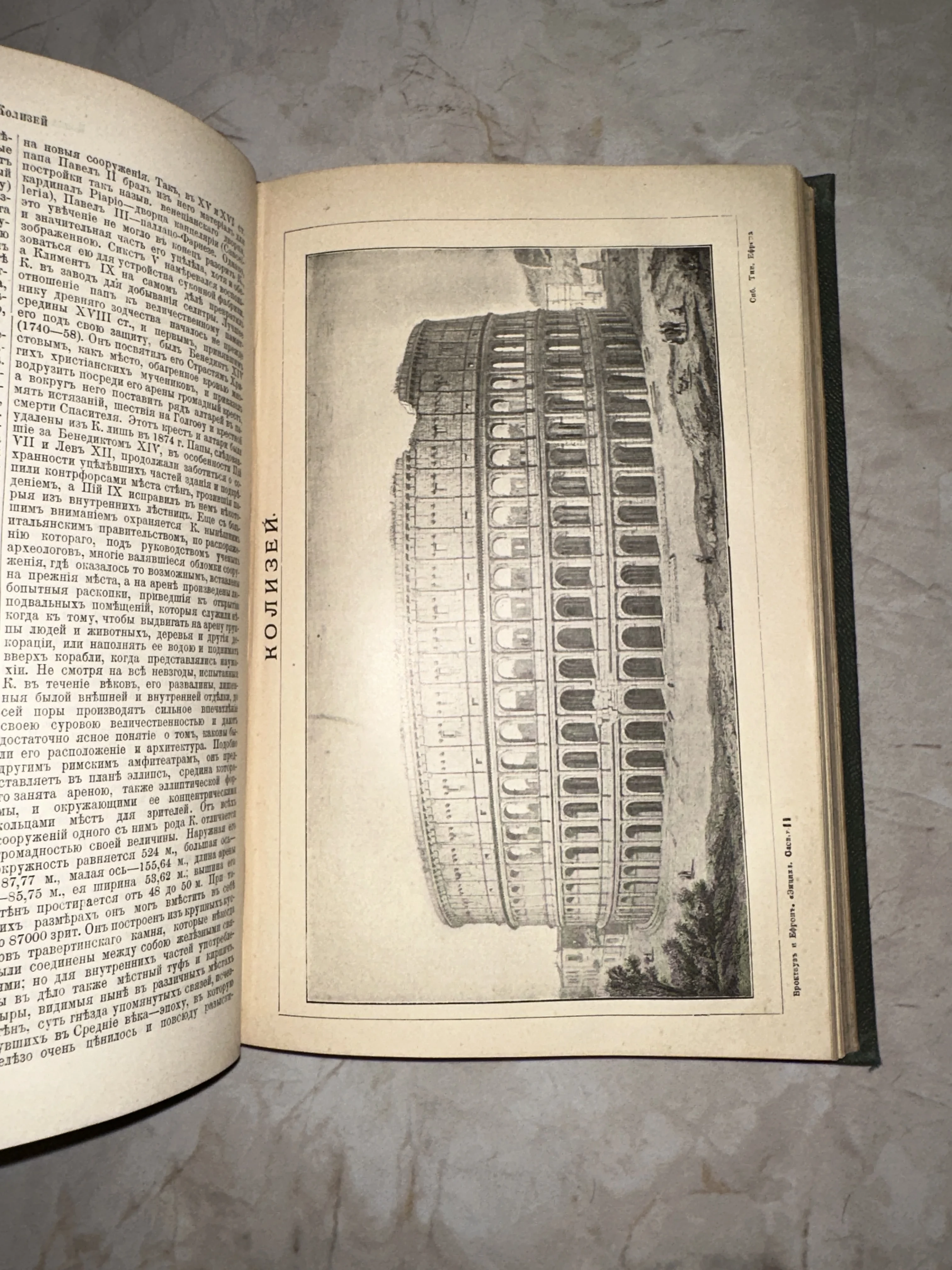 Уникальный разворот из знаменитого энциклопедического словаря Брокгауза и Ефрона, запечатлевший величие римского Колизея. Изящная гравюра в сочетании с дореволюционной орфографией создает неповторимую атмосферу интеллектуального наследия конца XIX века. Идеальный образец для оформления интерьера или пополнения частной коллекции редких печатных изданий.