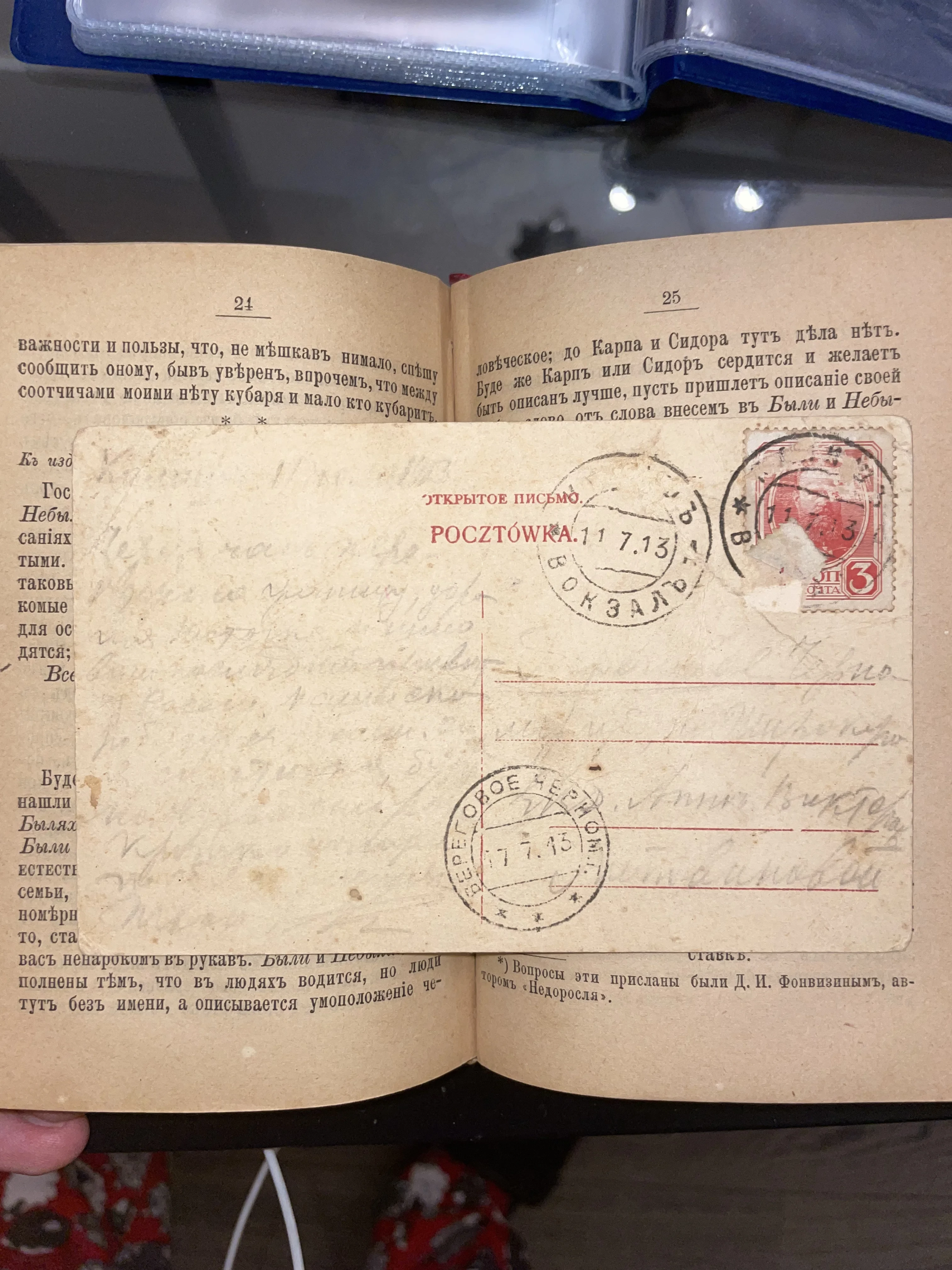 Антикварная почтовая карточка с марками и штемпелями 1913 года, лежащая на страницах открытой старой книги.
