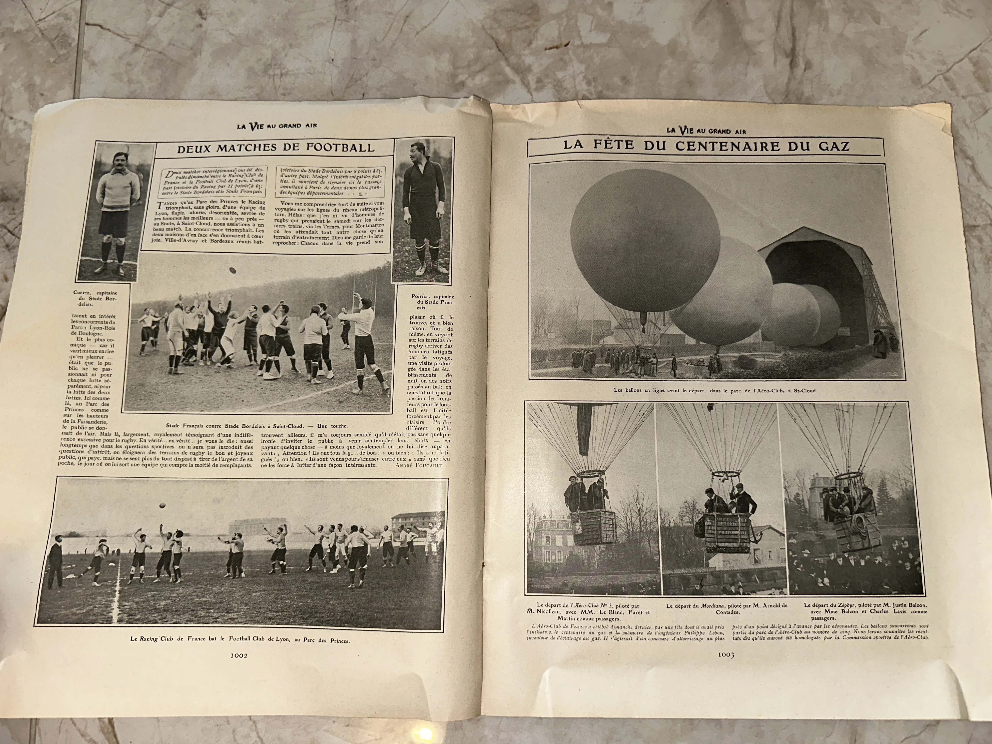 Редкий подлинный разворот еженедельника «La Vie au Grand Air», запечатлевший зарю эпохи массового спорта и воздухоплавания. На страницах с благородной патиной соседствуют репортажи о первых футбольных баталиях и величественном старте монгольфьеров в Сен-Клу. Этот лот станет изысканным дополнением коллекции спортивной меморабилии или атмосферным элементом интерьера в стиле Belle Époque.