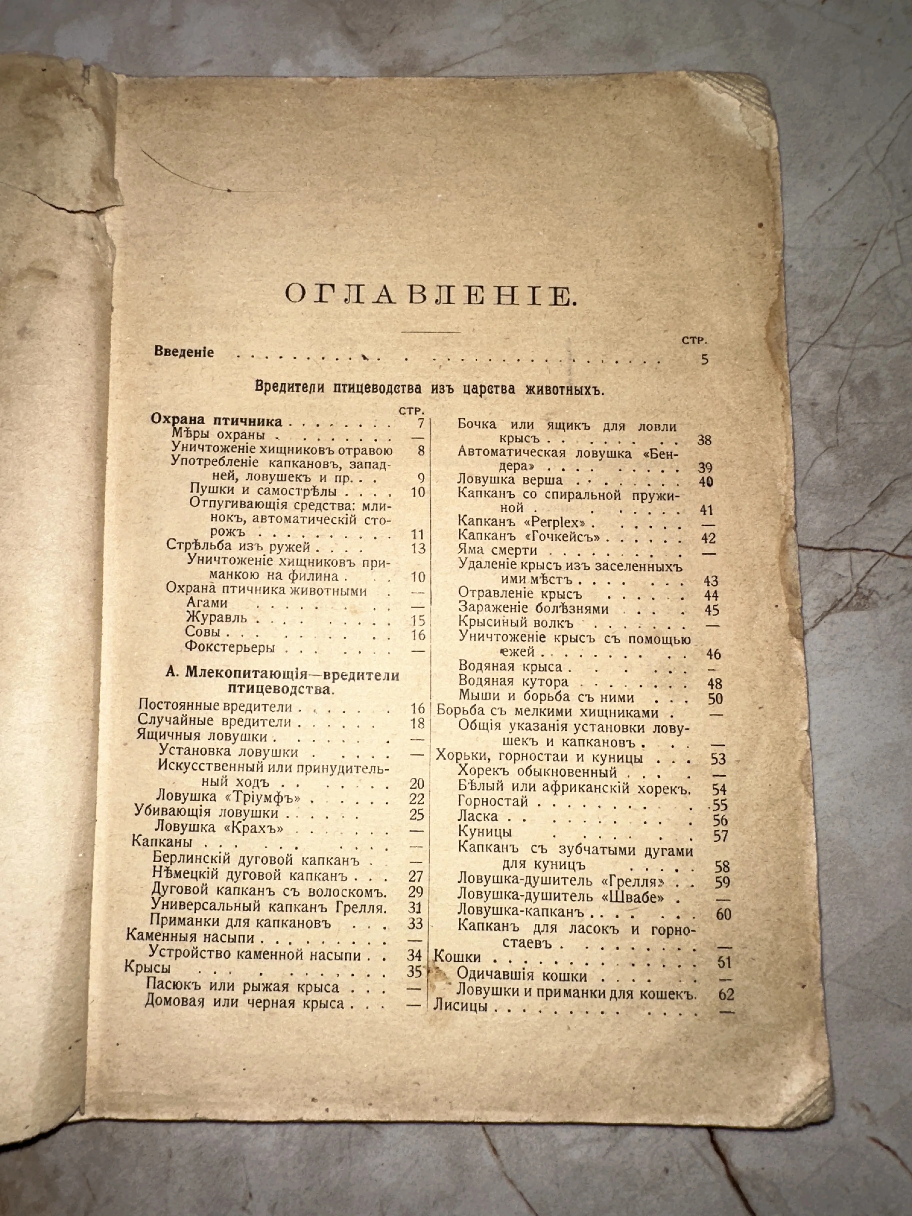 Оглавление старинной книги на русском языке с дореформенной орфографией, посвященное борьбе с вредителями птицеводства и описанию ловушек.