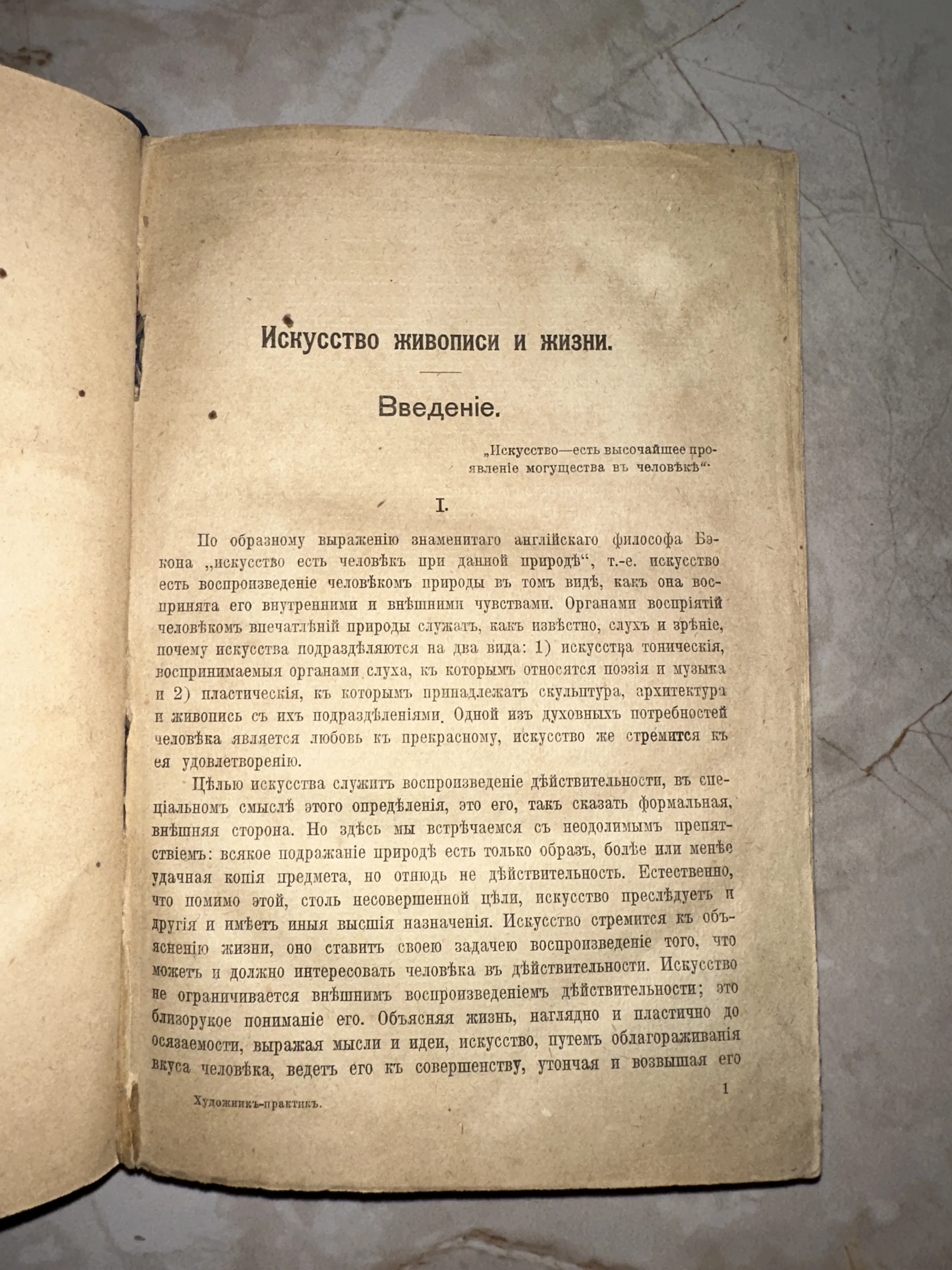 Разворот старинной книги с заголовком «Искусство живописи и жизни. Введение», напечатанный дореволюционным шрифтом на пожелтевшей бумаге.