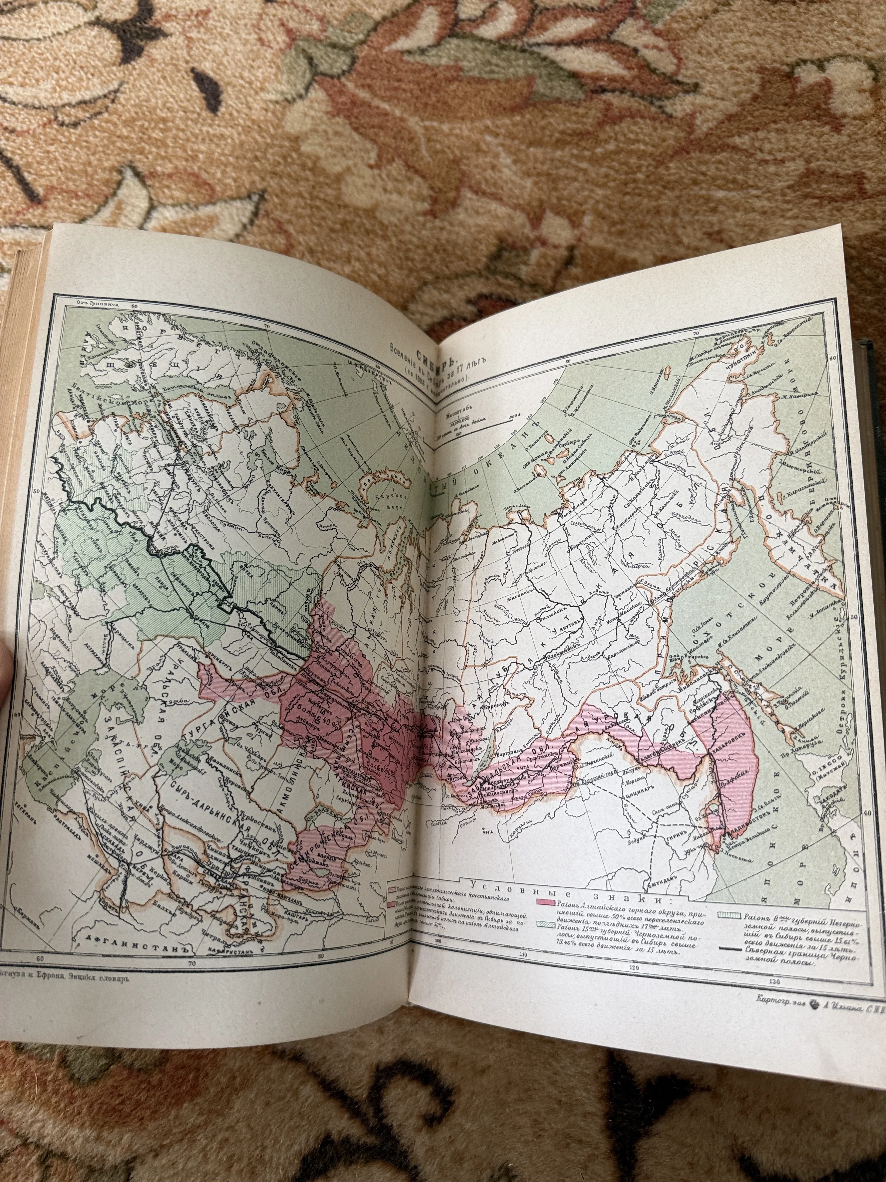 Разворот старинной книги с цветной литографированной картой Сибири и Дальнего Востока начала XX века.