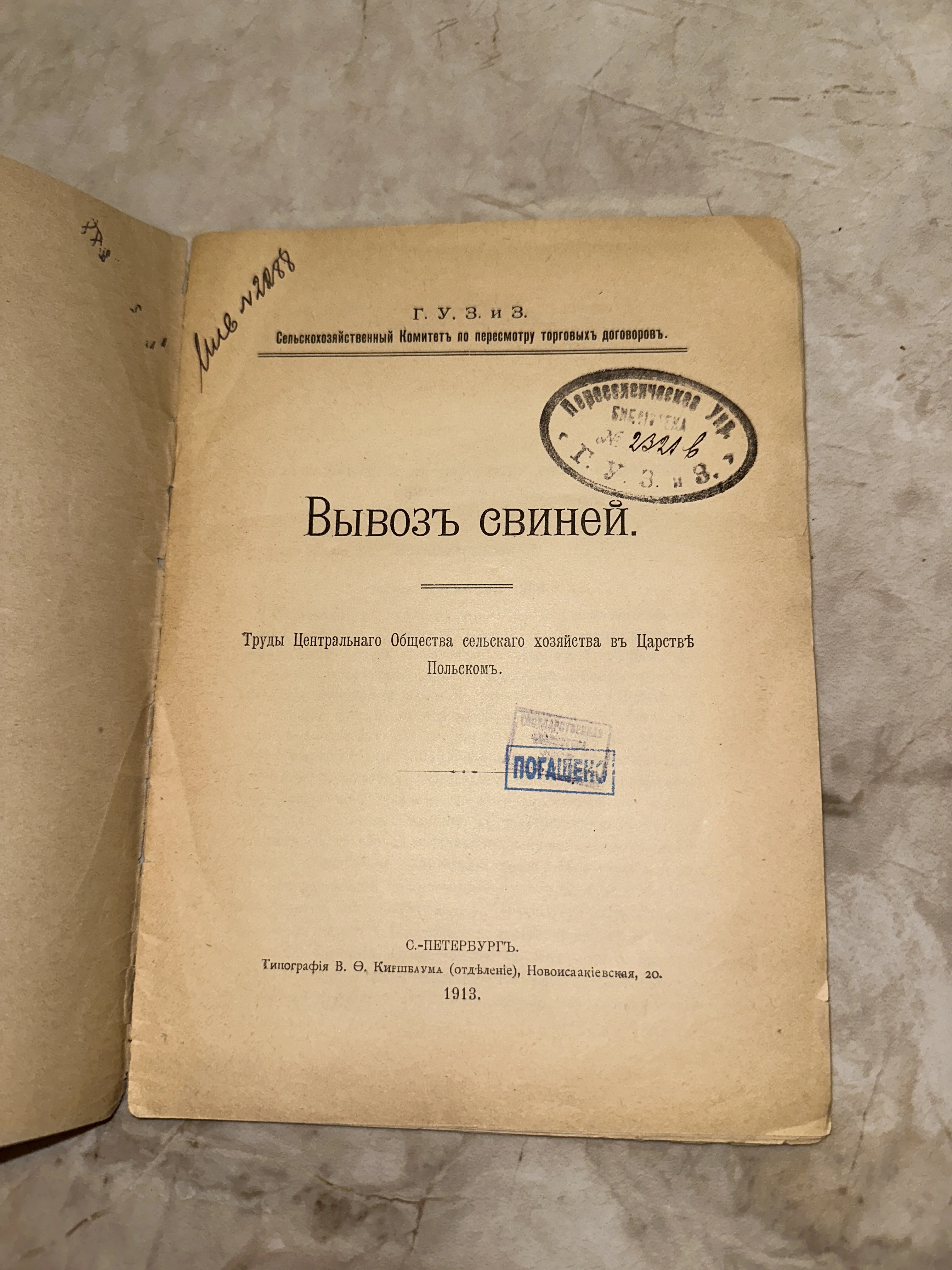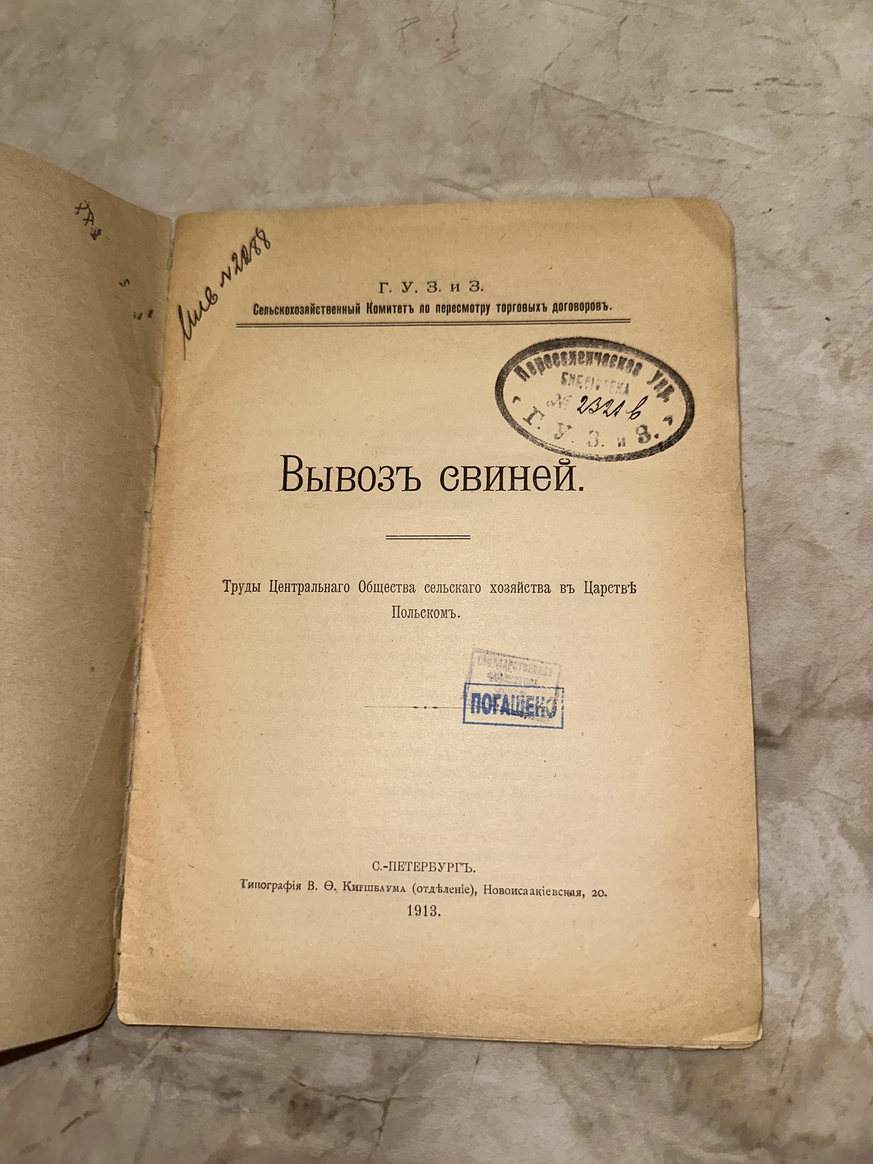 Титульный лист старинной книги 1913 года под названием Вывоз свиней с библиотечными штампами и рукописными пометками.