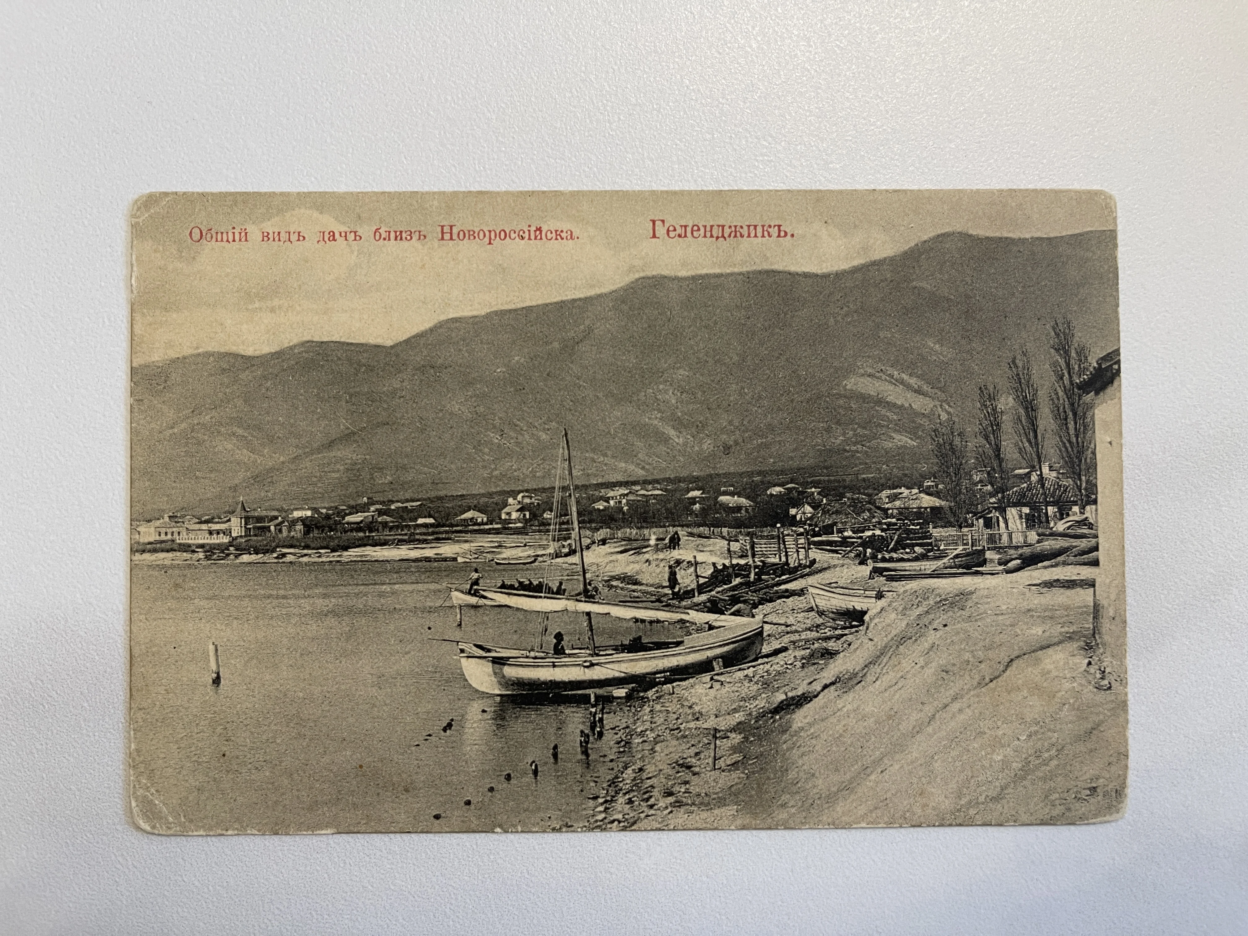 Редкая видовая открытка, запечатлевшая зарождение курортного Геленджика с его уютными дачами у подножия величественных гор. На переднем плане детально прорисованы рыбацкие лодки на берегу, а старинная типографская печать передает подлинную атмосферу черноморского побережья дореволюционной России.