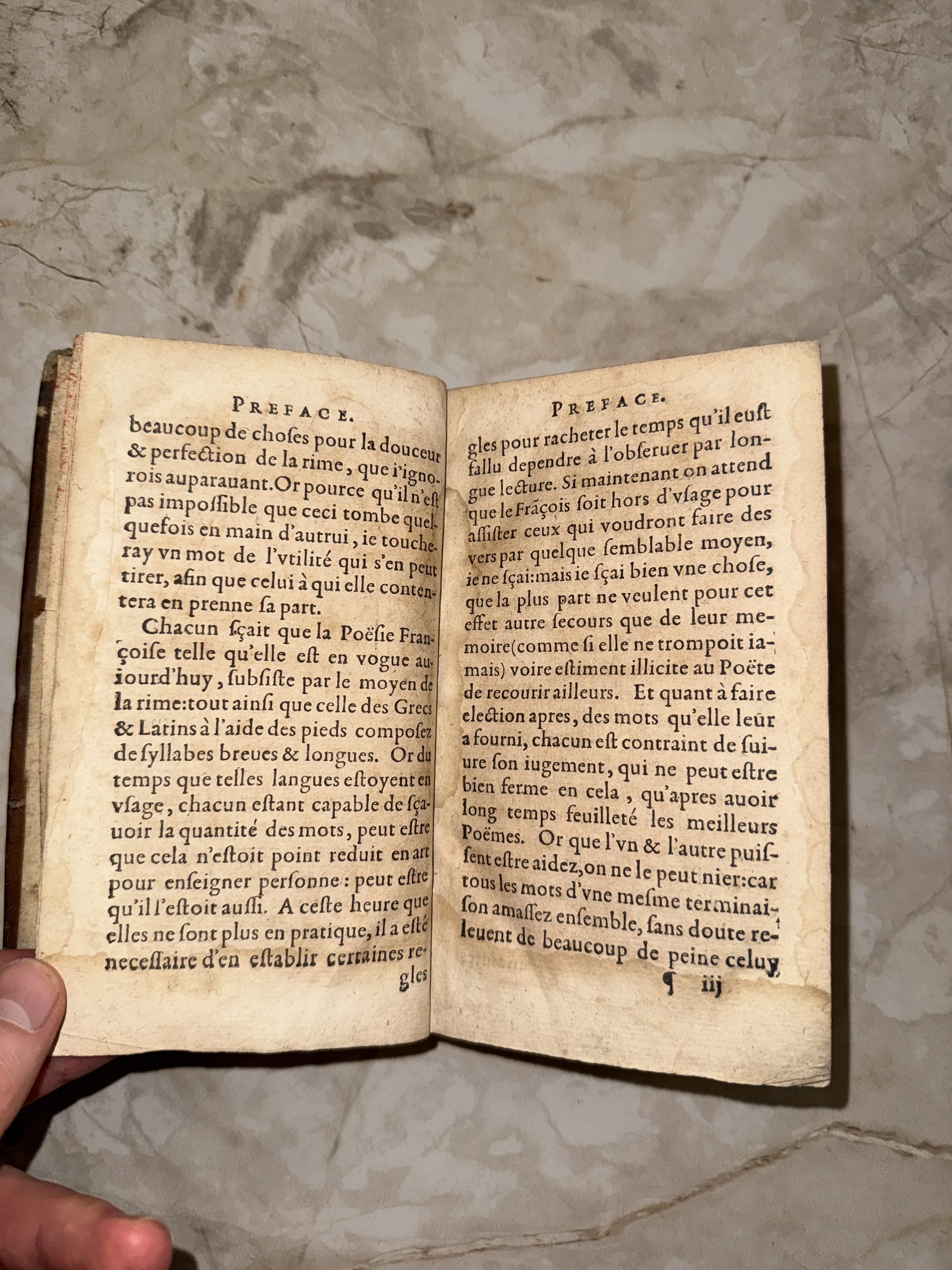 Разворот старинной книги с текстом на французском языке и заголовком Preface на пожелтевшей бумаге.