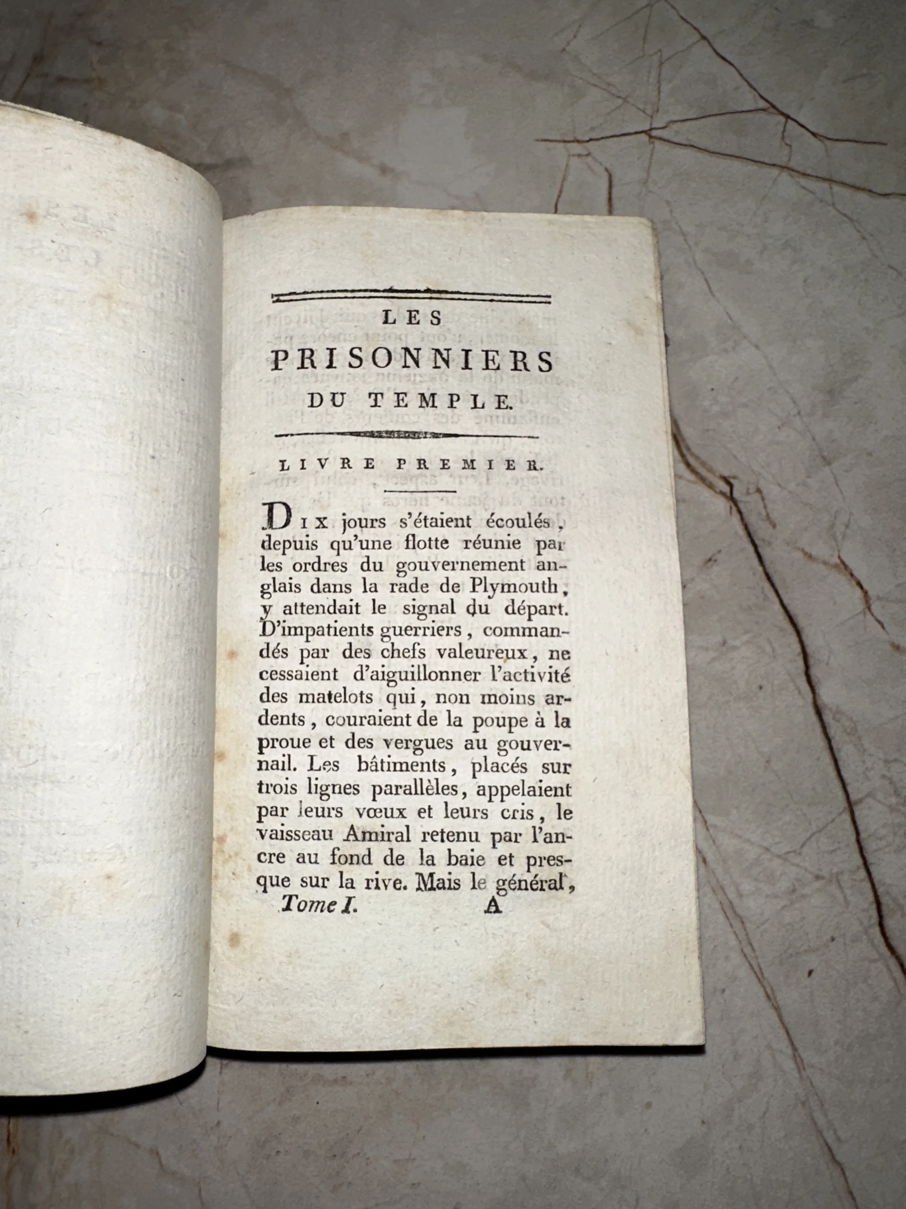 Разворот старинной книги XVIII-XIX века с французским текстом Les Prisonniers du Temple на фоне мраморного стола.