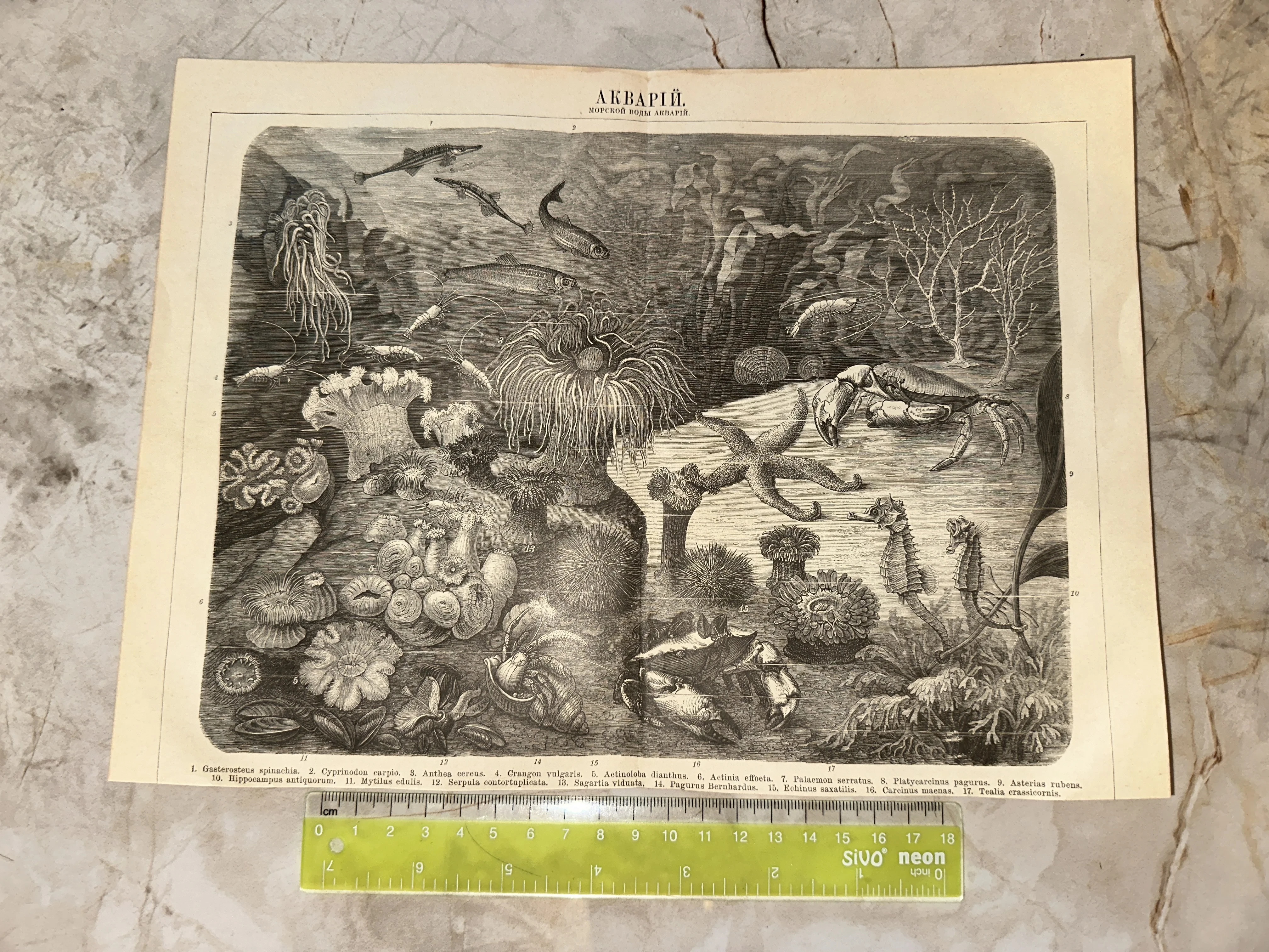 Великолепный образец научной иллюстрации конца XIX века, запечатлевший биоразнообразие морского дна в мельчайших деталях. Лист сохранил благородную патину времени, а тонкая штриховка подчеркивает изящество морских коньков и фактуру коралловых рифов. Эта работа станет изысканным дополнением интерьера в классическом или кабинетном стиле.