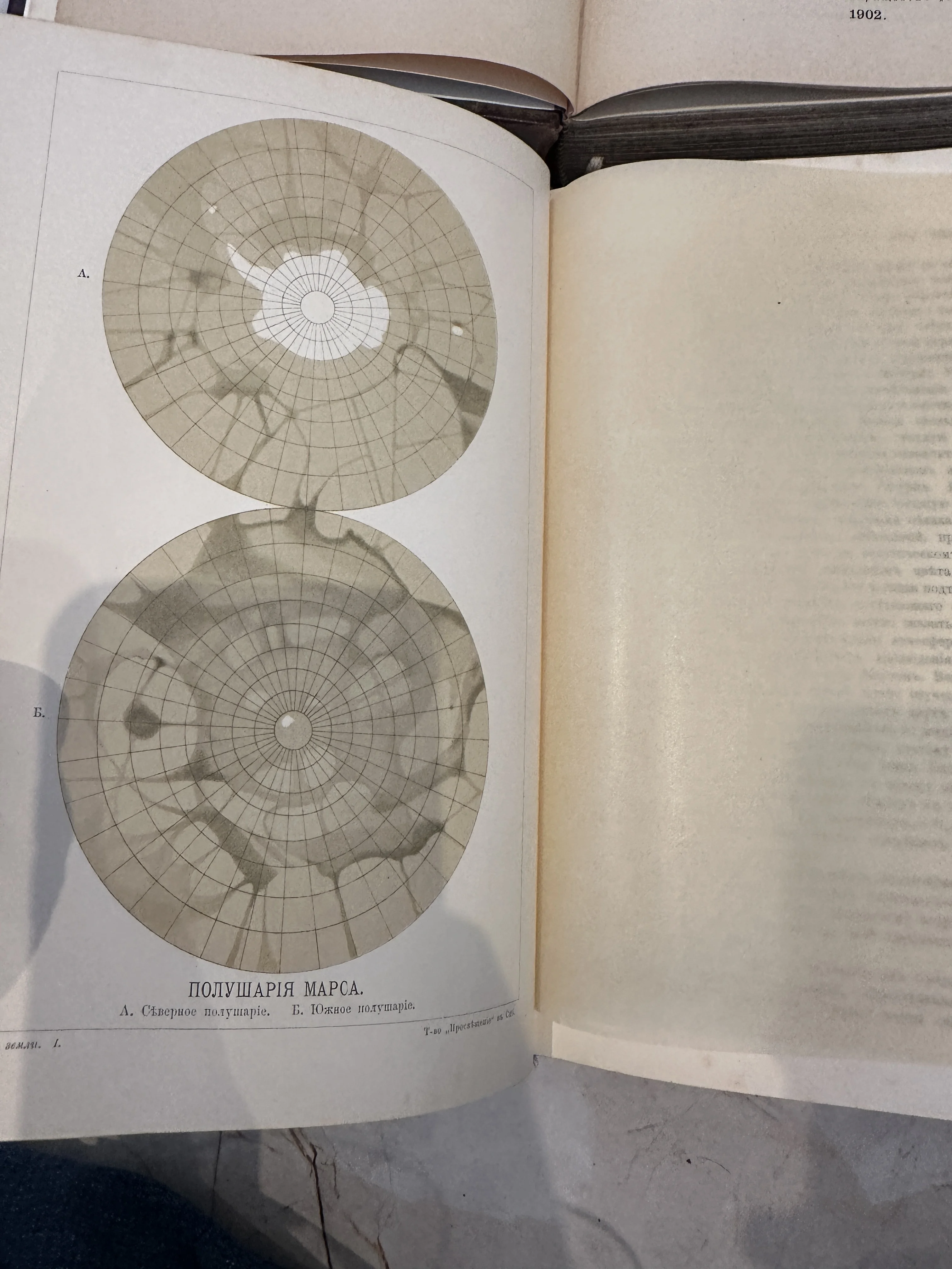 Черно-белая иллюстрация северного и южного полушария Марса на странице антикварной книги начала XX века.