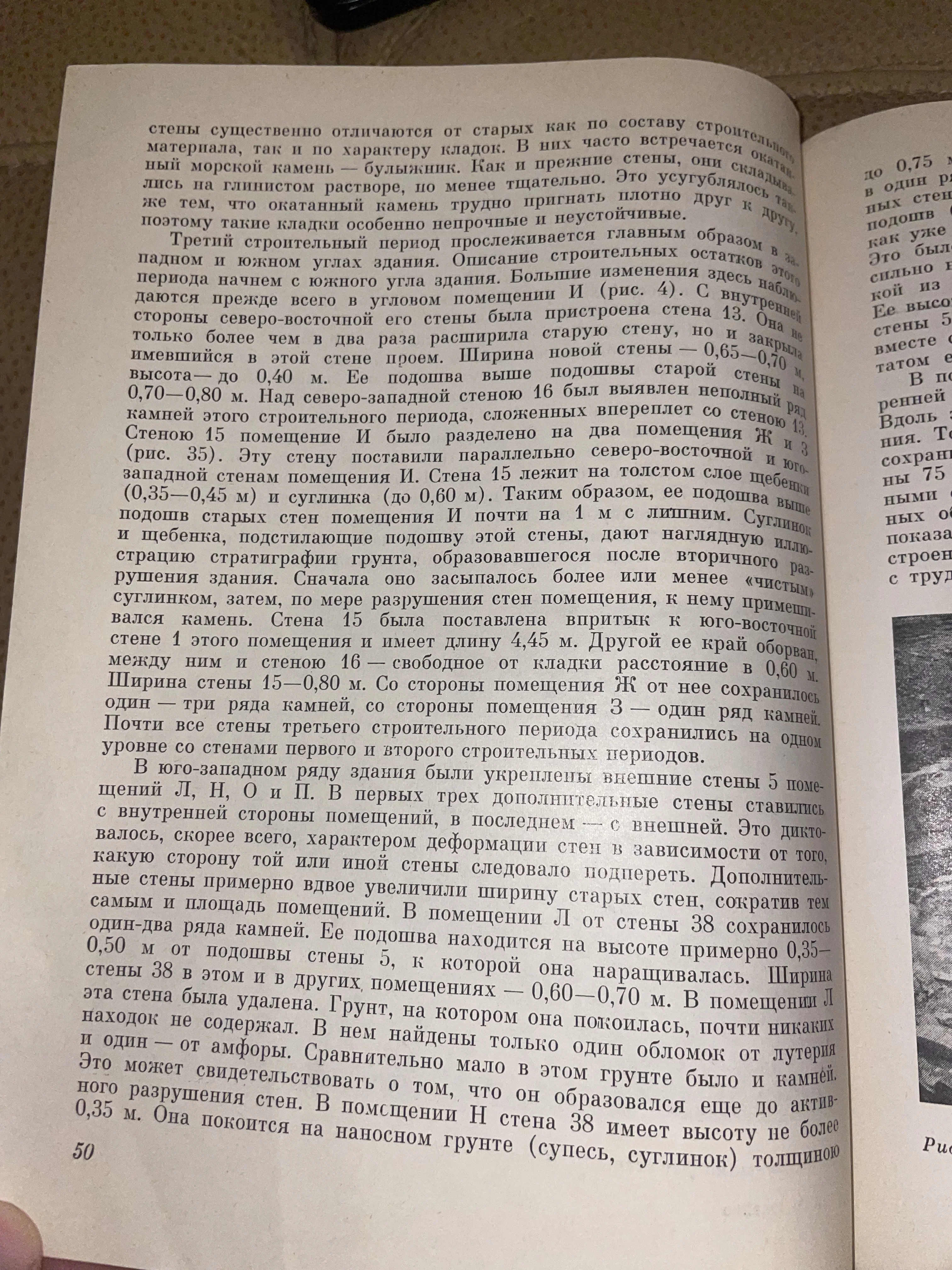 Перед вами страница из фундаментального научного труда, посвященного детальному анализу строительных периодов и древней архитектуры. Четкая типографская печать на плотной бумаге и профессиональная терминология передают дух серьезных исторических открытий прошлого века. Прекрасный образец специализированной литературы для пополнения частной коллекции или научной библиотеки.