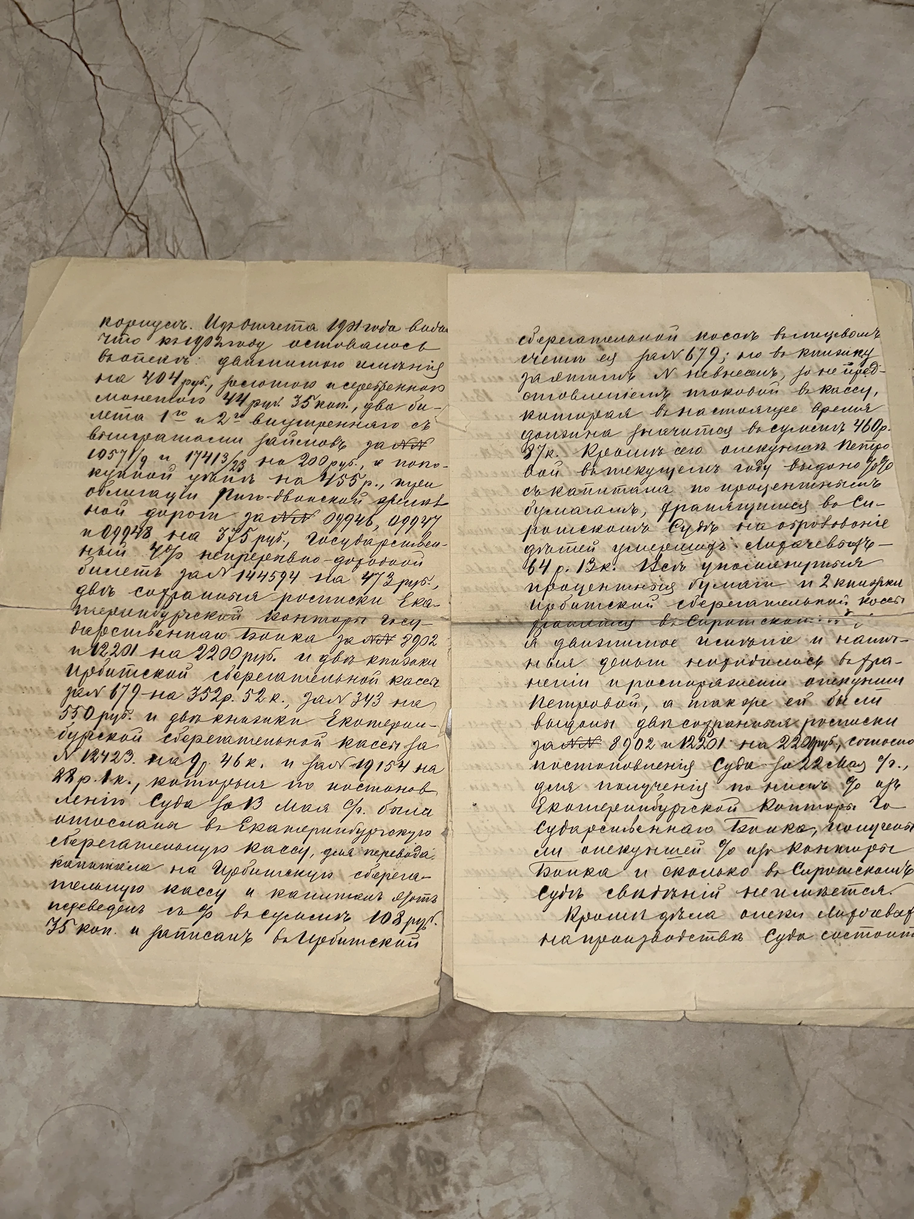 Уникальное свидетельство эпохи: старинный отчет, подробно описывающий банковские вклады и денежные суммы в рублях и копейках. Текст, выведенный каллиграфическим почерком, упоминает Екатеринбургскую контору Государственного банка и Сиротский суд, погружая в атмосферу бюрократии и частной жизни дореволюционной России. Артефакт сохранил свою целостность, став ценным источником для исследователей истории и коллекционеров архивных редкостей.