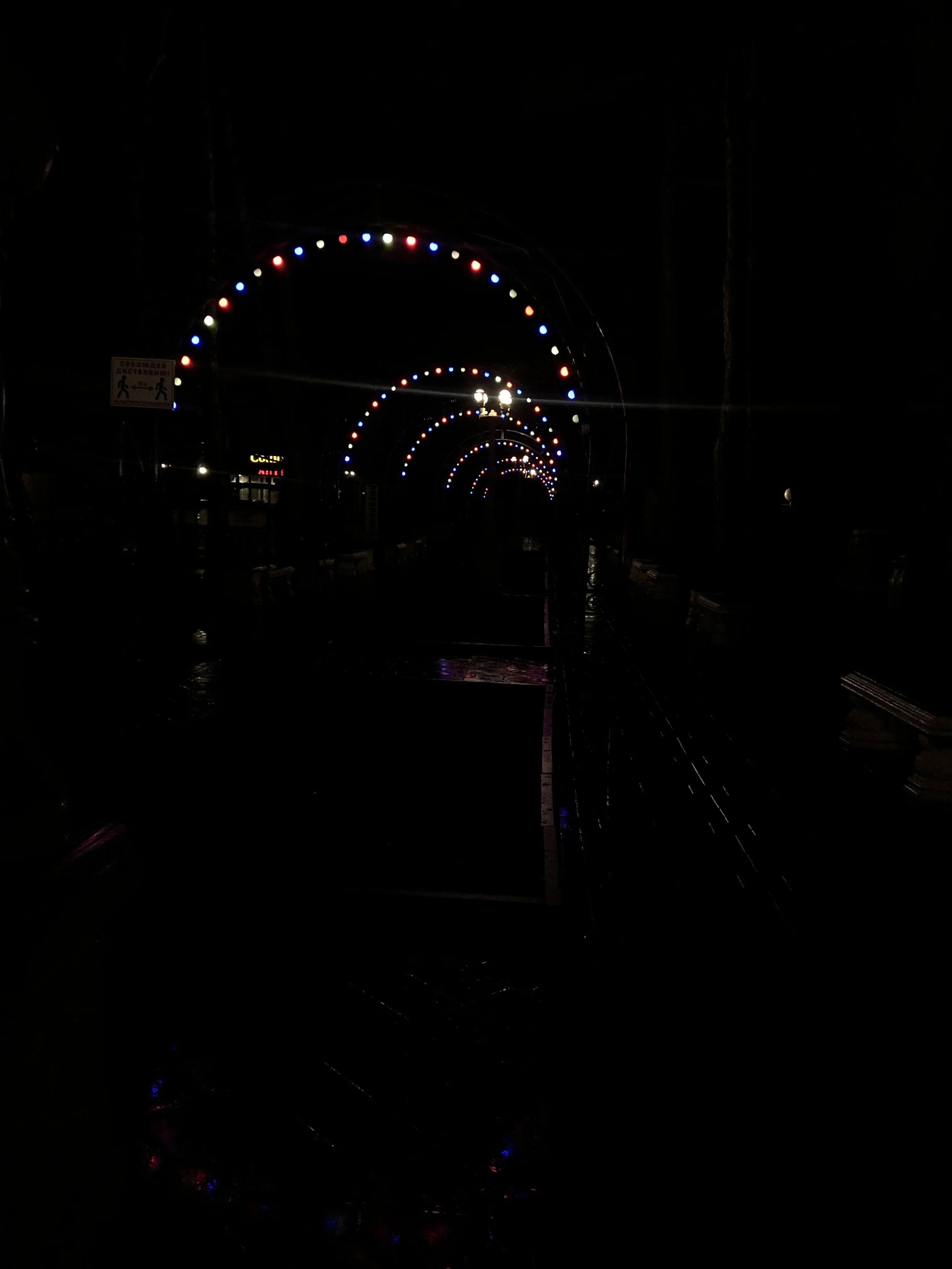 Ночной вид парковой аллеи с последовательностью светящихся полукруглых арок с красными, белыми и синими огнями в полной темноте.