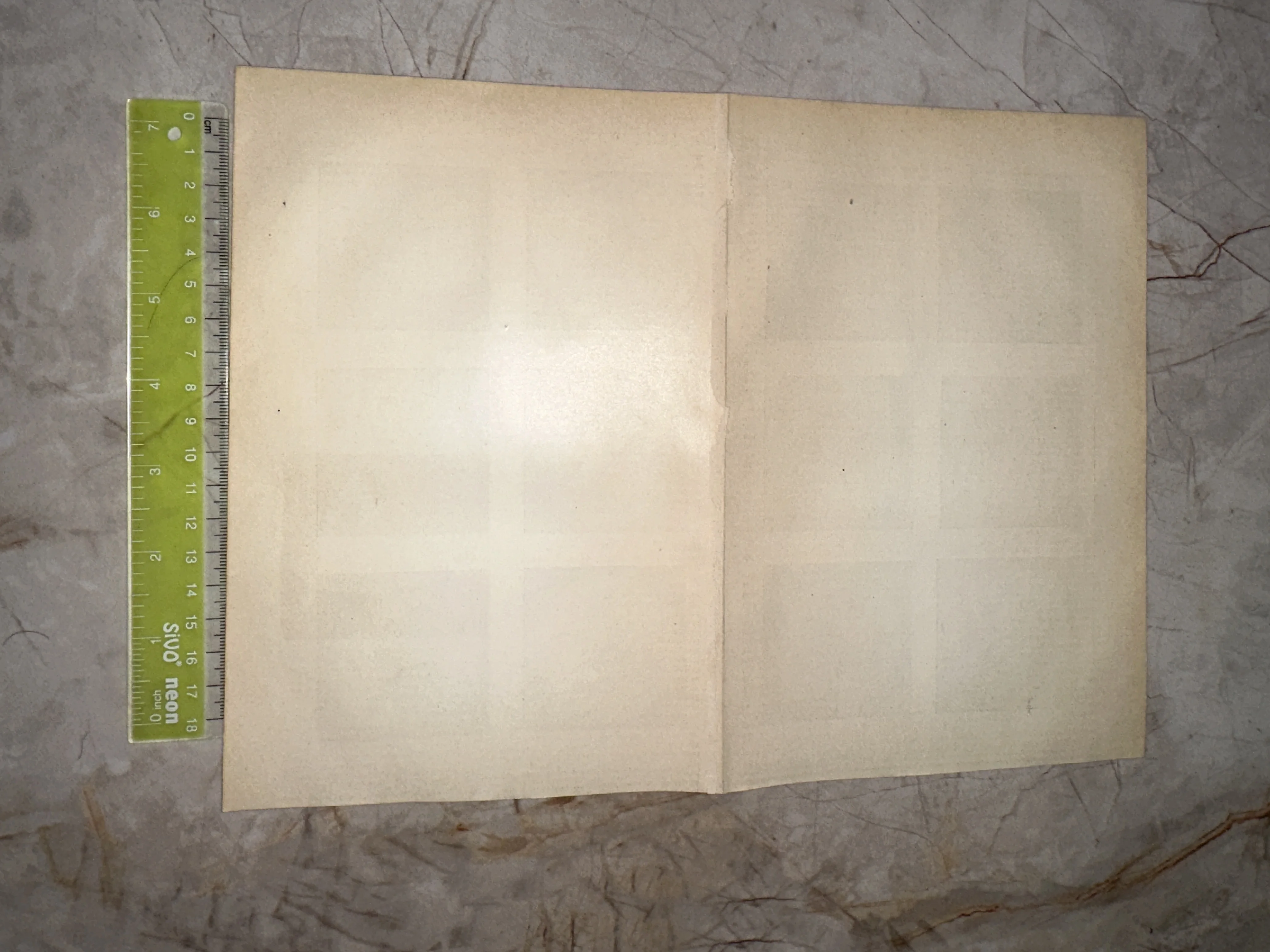 Аутентичный образец старинной бумаги с благородной патиной и характерным теплым оттенком, приобретенным за десятилетия. Чистая поверхность разворота сохранила текстуру эпохи, что делает его ценным материалом для реставрации или уникальным фоном для коллекционных предметов.